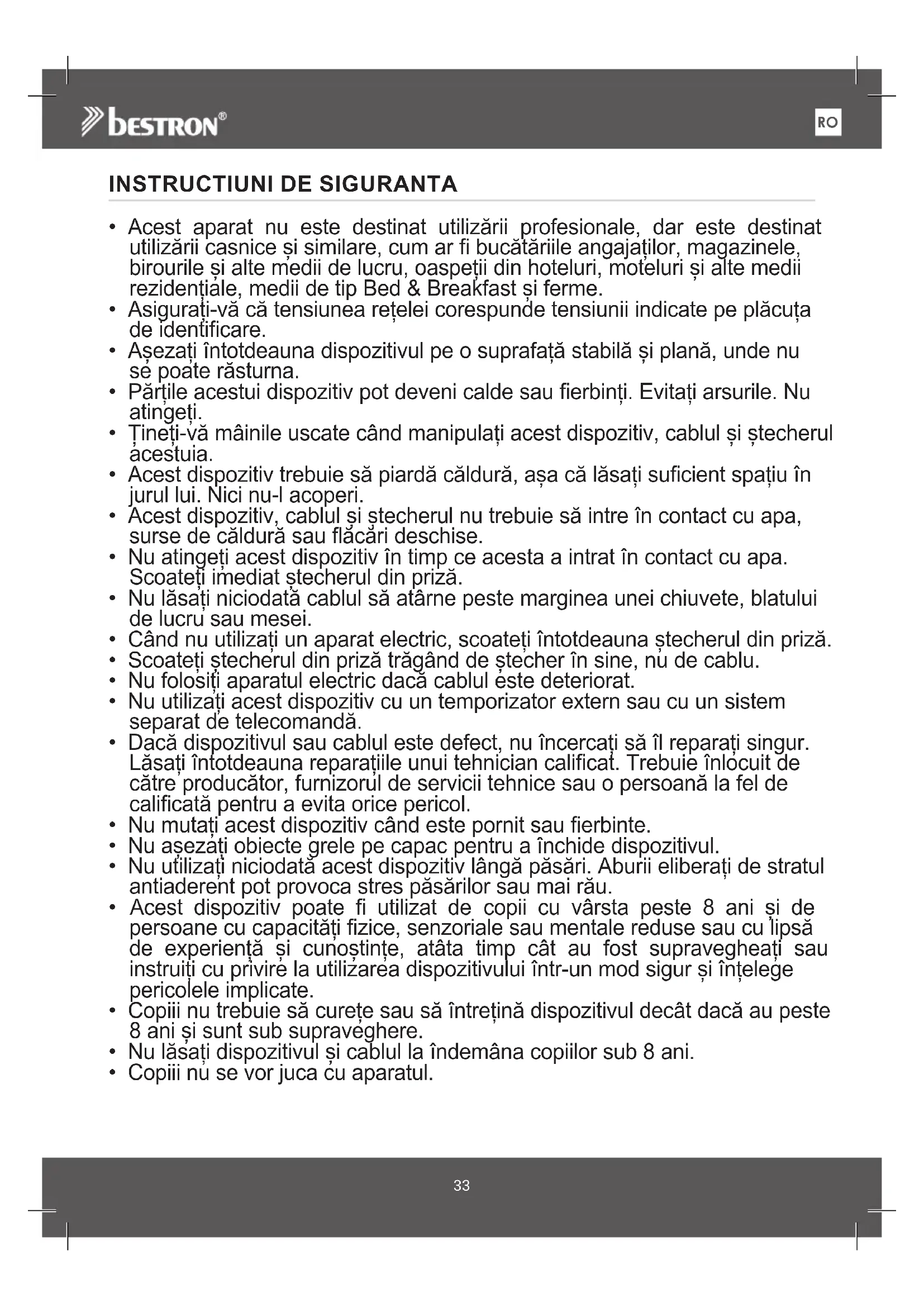 - Municipalitatea dumneavoastră vă poate spune unde puteți găsi un punct de colectare a deșeurilor desemnat în zona dumneavoastră. MUNCĂ În cazul puțin probabil al unei defecțiuni, contactați Serviciul Clienți Be- stron: www.bestron.com/service Specificatii tehnice Model AMW500 Rețea 220-240V~ Frecvență (Hz) 50/60 Clasa de siguranță 1 Putere (Watt) 550 Zgomot (dB(A)) - Max. Capacitate - Timp maxim de funcționare continuă (KB) - Dimensiuni (L x l x h) (cm) 9x13x17 Lungimea cablului (cm) 67RO
