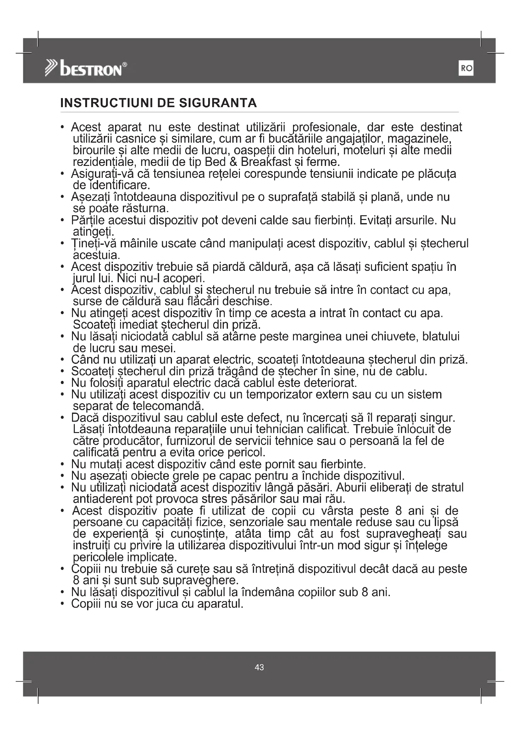 - Municipalitatea dumneavoastră vă poate spune unde puteți găsi un punct de colectare a deșeurilor desemnat în zona dumneavoastră. MUNCĂ În cazul puțin probabil al unei defecțiuni, contactați Serviciul Clienți Be- stron: www.bestron.com/service Specicatii tehnice Model ASW401 Rețea 220-240V~ Frecvență (Hz) 50/60 Clasa de siguranță 1 Putere (Watt) 700 Zgomot (dB(A)) - Max. Capacitate - Timp maxim de funcționare continuă (KB) - Dimensiuni (L x l x h) (cm) 24x23x9,4 Lungimea cablului (cm) 70