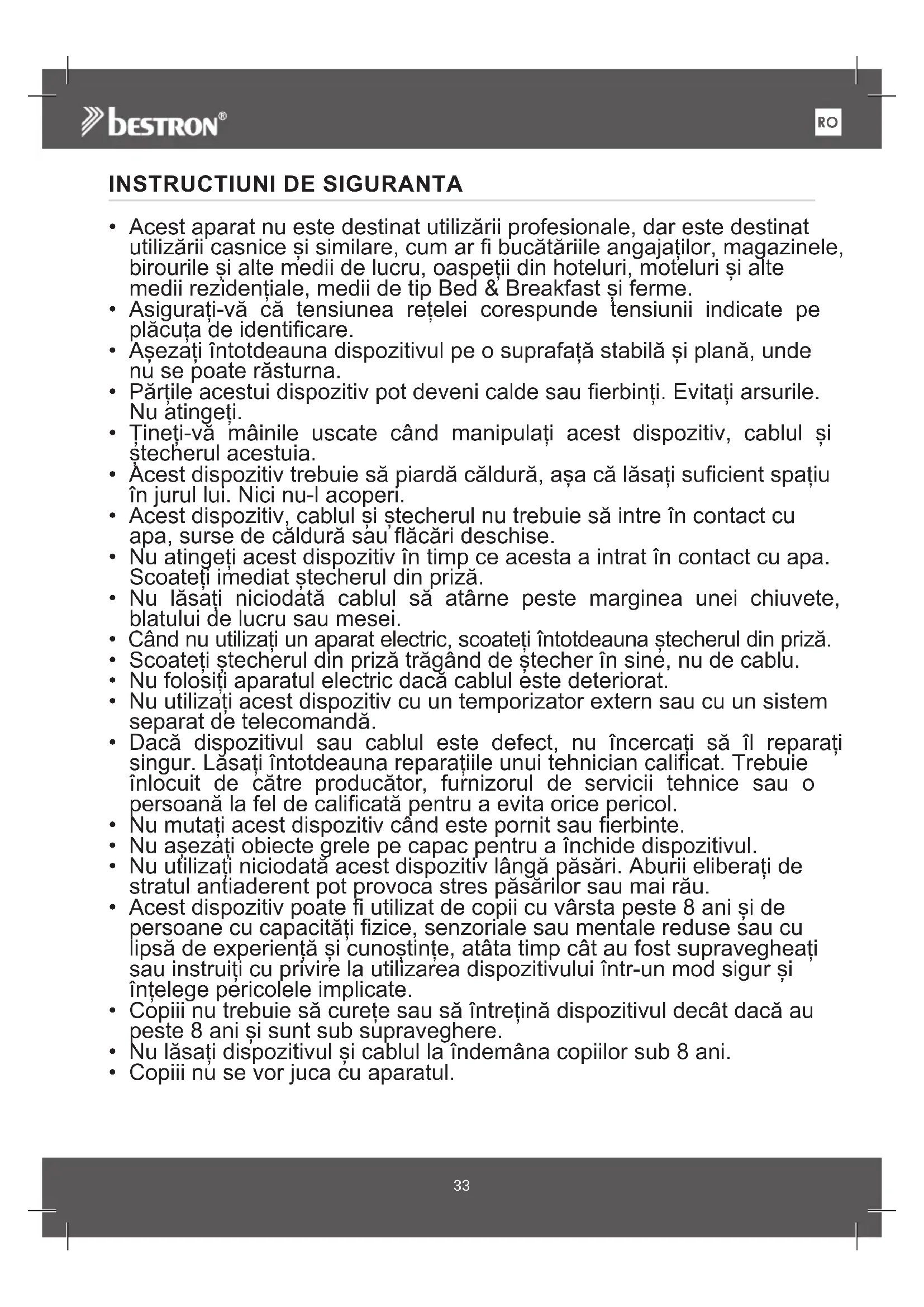- Municipalitatea dumneavoastră vă poate spune unde puteți găsi un punct de colectare a deșeurilor desemnat în zona dumneavoastră. MUNCĂ În cazul puțin probabil al unei defecțiuni, contactați Serviciul Clienți Bestron: www.bestron.com/service Specificatii tehnice Model ABWM300 Rețea 220-240V~ Frecvență (Hz) 50/60 Clasa de siguranță 1 Putere (Watt) 700 Zgomot (dB(A)) - Max. Capacitate - Timp maxim de funcționare continuă (KB) - Dimensiuni (L x l x h) (cm) 26,0x21,0x8,8 Lungimea cablului (cm) 68RO