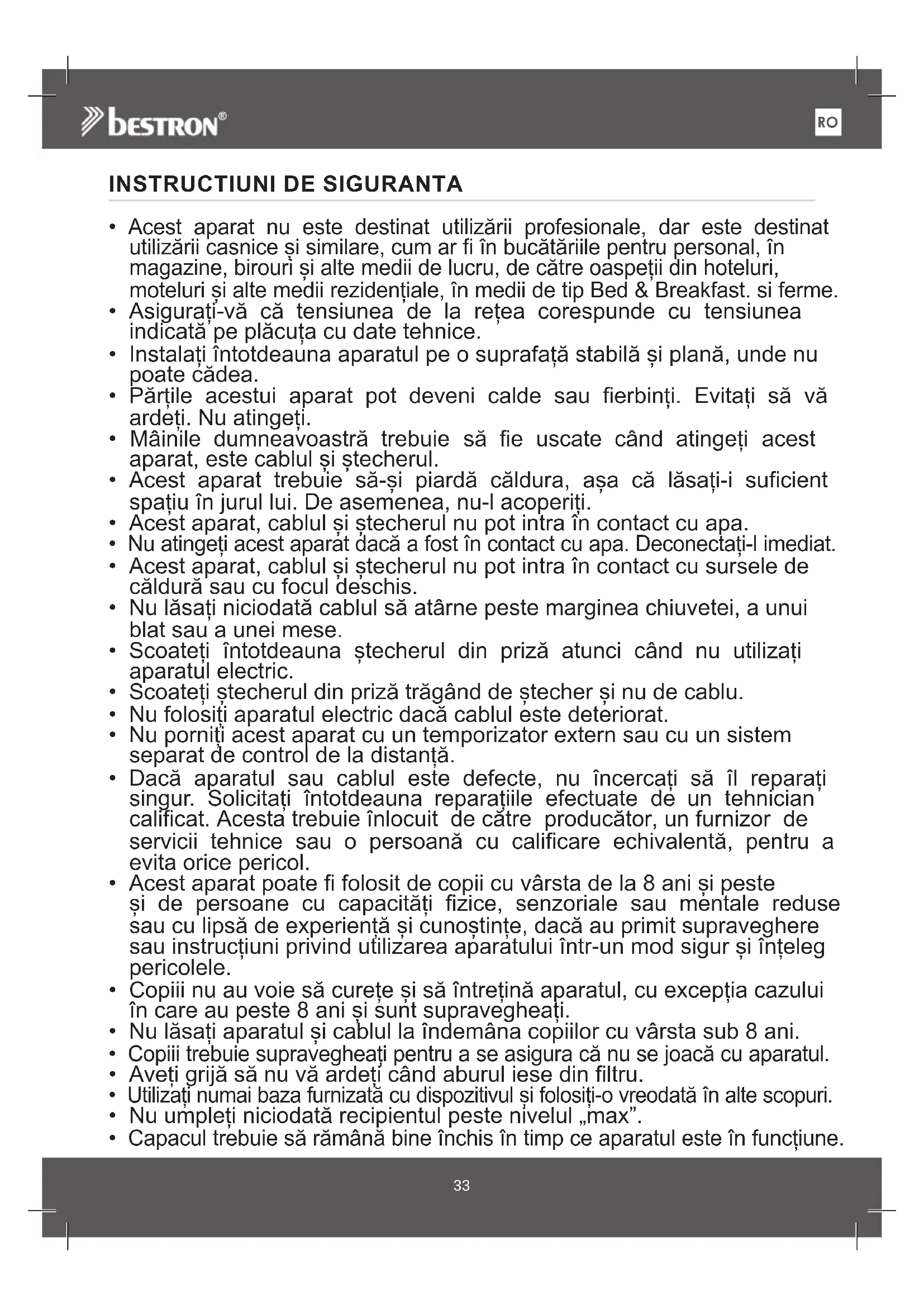- Municipalitatea dumneavoastră vă poate spune unde puteți găsi punctul de colectare a deșeurilor desemnat în cartierul dumneavoastră. SERVICIU În cazul puțin probabil al unei defecțiuni, vă rugăm să contactați serviciul pentru clienți Bestron: www.bestron.com/service Specificatii tehnice Model AWK2200BW Rețea 220-240V Frecvență (Hz) 50-60 Clasa de siguranță 1 Putere (Watt) 1850-2200 Zgomot (dB(A)) - Max. Capacitate - Timp maxim de funcționare continuă (KB) - Dimensiuni (L x l x h) (cm) 23,2x16,1x23,9 Lungimea cablului (cm) 70RO
