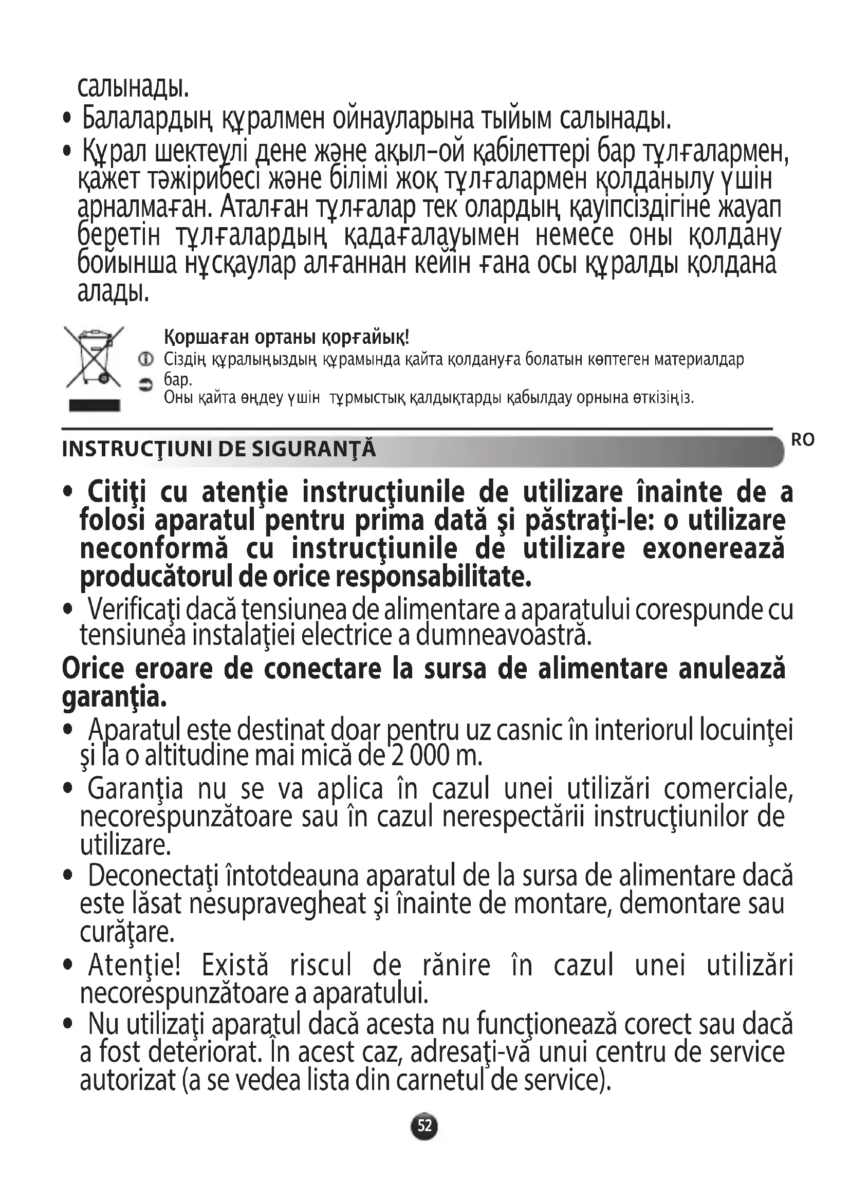 - Acest aparat poate fi utilizat de persoane care au capacităţi fizice, senzoriale sau mentale reduse sau a căror experienţă sau ale căror cunoştinţe nu sunt suficiente, cu condiţia ca acestea să beneficieze de supraveghere sau să fi primit instrucţiuni în ceea ce priveşte utilizarea aparatului în deplină siguranţă şi cu înţelegerea corectă a tuturor pericolelor posibile. Să contribuim la protecţia mediului! Aparatul dumneavoastră conţine numeroase materiale refolosibile sau reciclabile.Vă rugăm să îl duceţi la un punct de colectare a deşeurilor pentru a fi eliminat corespunzător. VARNOSTNI NAPOTKI