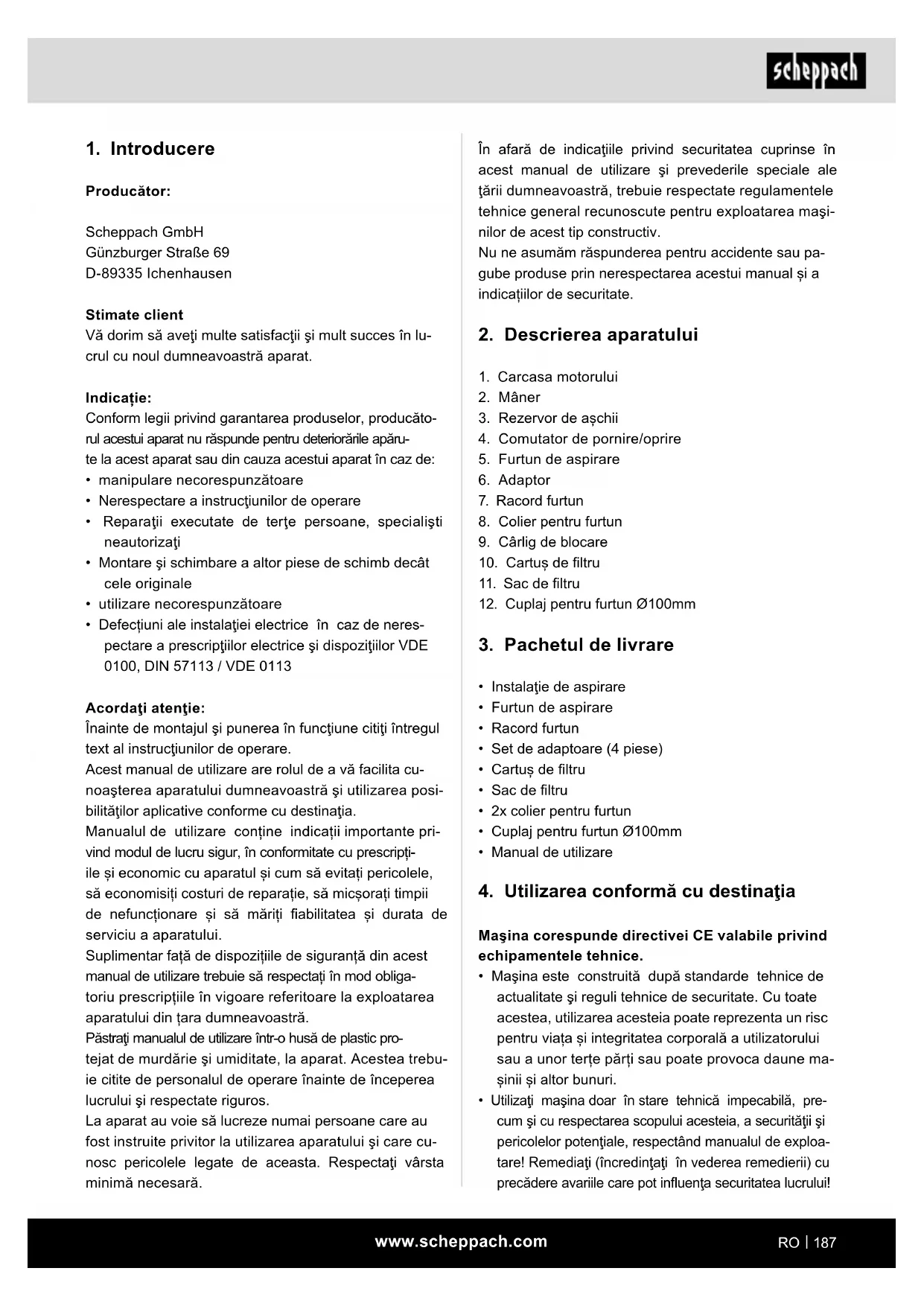 - Defecțiuni ale instalaţiei electrice în caz de neres- pectare a prescripţiilor electrice şi dispoziţiilor VDE 0100, DIN 57113 / VDE 0113 Acordaţi atenţie: Înainte de montajul şi punerea în funcţiune citiţi întregul text al instrucţiunilor de operare. Acest manual de utilizare are rolul de a vă facilita cu- noaşterea aparatului dumneavoastră şi utilizarea posi- bilităţilor aplicative conforme cu destinaţia. Manualul de utilizare conține indicații importante pri- vind modul de lucru sigur, în conformitate cu prescripți- ile și economic cu aparatul și cum să evitați pericolele, să economisiți costuri de reparație, să micșorați timpii de nefuncționare și să măriți abilitatea și durata de serviciu a aparatului. Suplimentar față de dispozițiile de siguranță din acest manual de utilizare trebuie să respectați în mod obliga- toriu prescripțiile în vigoare referitoare la exploatarea aparatului din țara dumneavoastră. Păstraţi manualul de utilizare într-o husă de plastic pro- tejat de murdărie şi umiditate, la aparat. Acestea trebu- ie citite de personalul de operare înainte de începerea lucrului şi respectate riguros. La aparat au voie să lucreze numai persoane care au fost instruite privitor la utilizarea aparatului şi care cu- nosc pericolele legate de aceasta. Respectaţi vârsta minimă necesară.www.scheppach.com