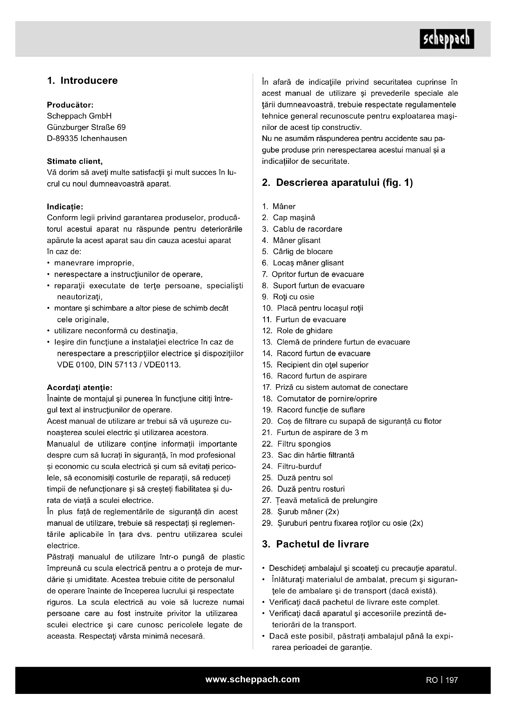 Producător: Scheppach GmbH Günzburger Straße 69 D-89335 Ichenhausen Stimate client, Vă dorim să aveţi multe satisfacţii şi mult succes în lu- crul cu noul dumneavoastră aparat. Indicație: Conform legii privind garantarea produselor, producă- torul acestui aparat nu răspunde pentru deteriorările apărute la acest aparat sau din cauza acestui aparat în caz de: