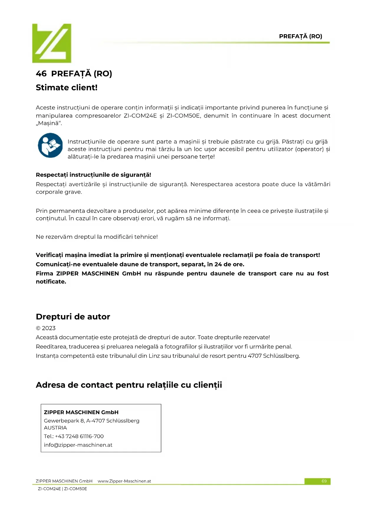 Aceste instruţiuni de operare contin informaţii si indicatori importante privind punerea în functiuneși manipularea compresoarelor ZI-COM24E si ZI-COM50E, denumit în continuare în acest document „Maşina".