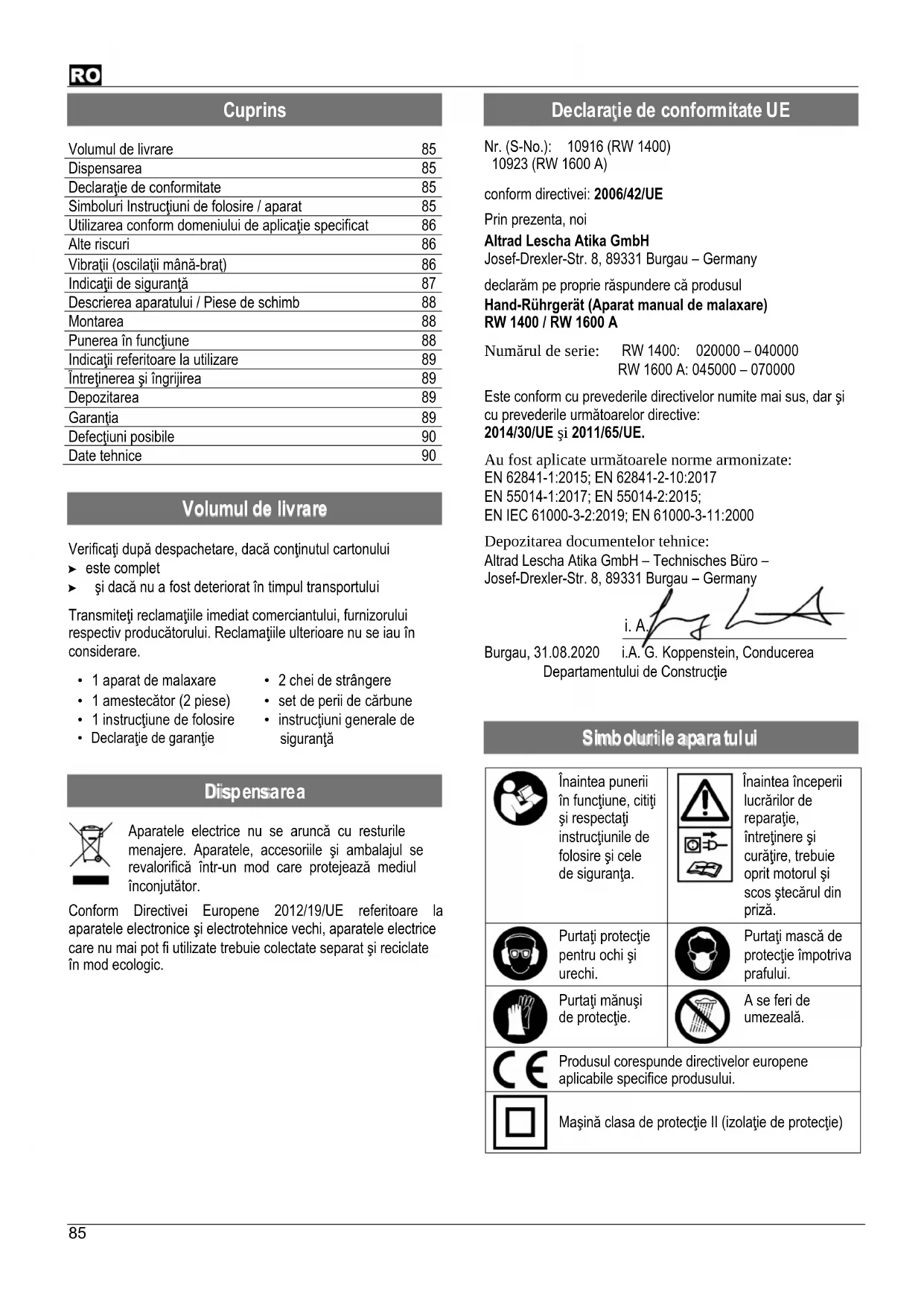 Vibraţiile mâinii a vnw = max 3,2 m/s²; Incertitudine de măsurare: K = 1,5 m/s² Avertizare: Valoarea reală a emisiilor de oscilaţii se poate abate în timpul utilizării maşinii de la valoarea indicată în instrucţiunile de folosire, respectiv de la cea indicată de producător. Acest lucru se poate datora următorilor factori, care trebuie respectaţi înaintea, respectiv în timpul utilizării: - Este maşina utilizată corect? - Este corect tipul de tăiere a materialului, respectiv modul de prelucrare a acestuia? - Este corespunzătoare starea de uzură a maşinii? - Este starea de ascuţire a amestecătoarelor în regulă, respectiv au fost montate amestecătoarele corecte? - Au fost montate mânerele, respectiv mânerele opţionale pentru reducerea vibraţiilor şi sunt bine fixate de corpul maşinii? Dacă în timpul utilizării, constataţi o senzaţie neplăcută a mâinilor sau o decolorare a acestora, întrerupeţi imediat lucrul cu maşina. Faceţi suficiente pauze de lucru. În cazul nerespectării indicaţiei referitoare la pauze de lucru suficiente, poate interveni sindromul vibraţiilor transmise sistemului mână-braţ. Trebuie evaluat gradul de solicitare în funcţie de volumul de lucru şi utilizarea maşinii iar pauzele trebuie făcute corespunzător. Astfel gradul de solicitare pe parcursul întregului timp de lucru poate fi redus substanţial. Reduceţi la minim riscul datorat expunerii la vibraţii. Întreţineţi această maşină conform instrucţiunilor de folosire Evitaţi utilizarea maşinii la temperaturi de t=10°C sau mai scăzute. Faceţi un plan de lucru prin care să poată fi reduse solicitările datorate vibraţiilor.87