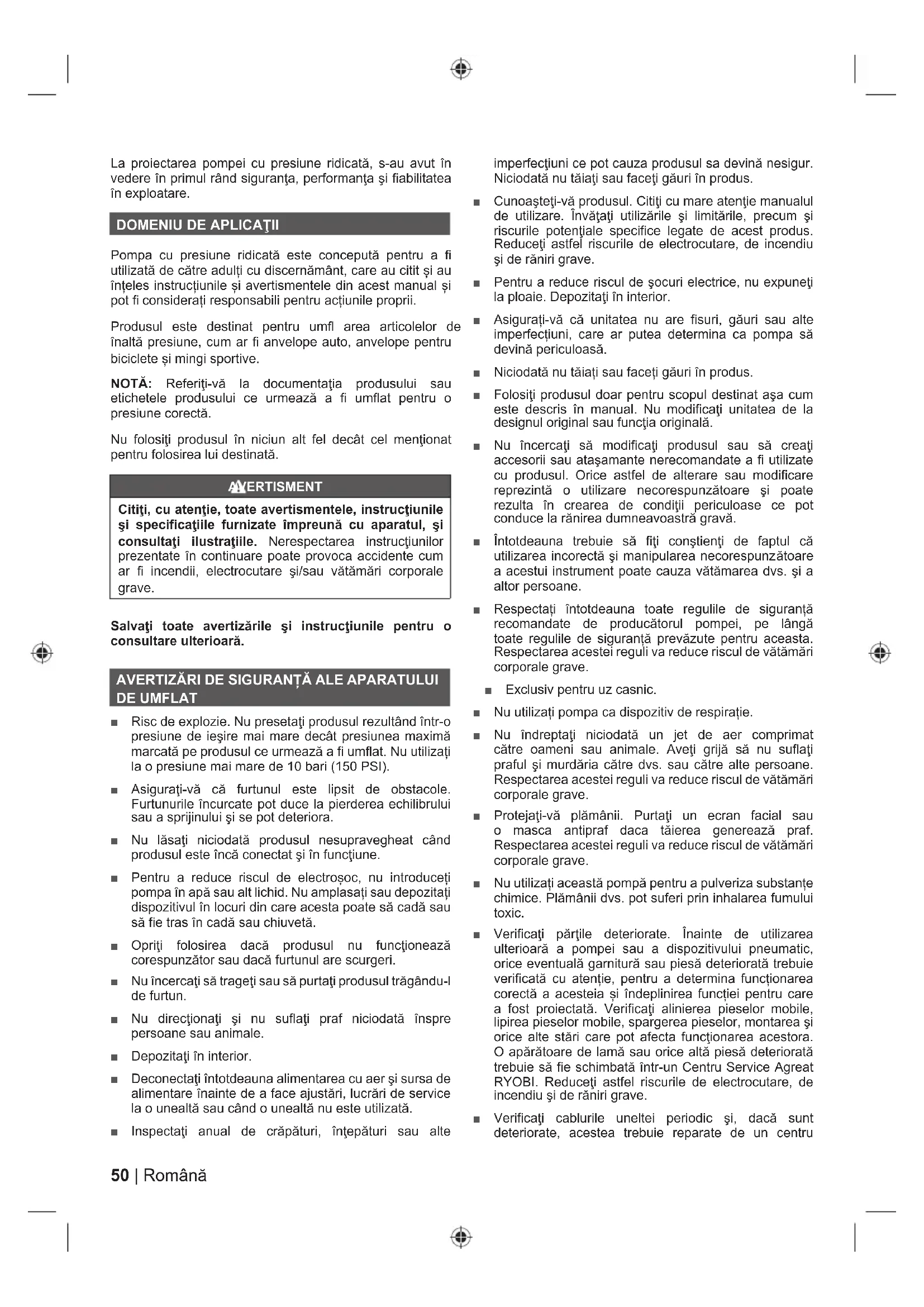 DE UMFLAT ■ Risc de explozie. Nu presetaţi produsul rezultând într-o presiune de ieşire mai mare decât presiunea maximă marcată pe produsul ce urmează a fi umflat. Nu utilizați la o presiune mai mare de 10 bari (150 PSI). ■ Asiguraţi-vă că furtunul este lipsit de obstacole. Furtunurile încurcate pot duce la pierderea echilibrului sau a sprijinului şi se pot deteriora. ■ Nu lăsaţi niciodată produsul nesupravegheat când produsul este încă conectat şi în funcţiune. ■ Pentru a reduce riscul de electroșoc, nu introduceți pompa în apă sau alt lichid. Nu amplasați sau depozitați dispozitivul în locuri din care acesta poate să cadă sau să fie tras în cadă sau chiuvetă. ■ Opriţi folosirea dacă produsul nu funcţionează corespunzător sau dacă furtunul are scurgeri. ■ Nu încercaţi să trageţi sau să purtaţi produsul trăgându-l de furtun. ■ Nu direcţionaţi şi nu suflaţi praf niciodată înspre persoane sau animale. ■ Depozitaţi în interior. ■ Deconectaţi întotdeauna alimentarea cu aer şi sursa de alimentare înainte de a face ajustări, lucrări de service la o unealtă sau când o unealtă nu este utilizată. ■ Inspectaţi anual de crăpături, înţepături sau alte imperfecţiuni ce pot cauza produsul sa devină nesigur. Niciodată nu tăiaţi sau faceţi găuri în produs. ■ Cunoaşteţi-vă produsul. Citiţi cu mare atenţie manualul de utilizare. Învăţaţi utilizările şi limitările, precum şi riscurile potenţiale specifice legate de acest produs. Reduceţi astfel riscurile de electrocutare, de incendiu şi de răniri grave. ■ Pentru a reduce riscul de şocuri electrice, nu expuneţi la ploaie. Depozitaţi în interior. ■ Asigurați-vă că unitatea nu are fisuri, găuri sau alte imperfecțiuni, care ar putea determina ca pompa să devină periculoasă. ■ Niciodată nu tăiați sau faceți găuri în produs. ■ Folosiţi produsul doar pentru scopul destinat aşa cum este descris în manual. Nu modificaţi unitatea de la designul original sau funcţia originală. ■ Nu încercaţi să modificaţi produsul sau să creaţi accesorii sau ataşamante nerecomandate a fi utilizate cu produsul. Orice astfel de alterare sau modificare reprezintă o utilizare necorespunzătoare şi poate rezulta în crearea de condiţii periculoase ce pot conduce la rănirea dumneavoastră gravă. ■ Întotdeauna trebuie să fiţi conştienţi de faptul că utilizarea incorectă şi manipularea necorespunzătoare a acestui instrument poate cauza vătămarea dvs. şi a altor persoane. ■ Respectați întotdeauna toate regulile de siguranță recomandate de producătorul pompei, pe lângă toate regulile de siguranță prevăzute pentru aceasta. Respectarea acestei reguli va reduce riscul de vătămări corporale grave. ■ Exclusiv pentru uz casnic. ■ Nu utilizați pompa ca dispozitiv de respirație. ■ Nu îndreptaţi niciodată un jet de aer comprimat către oameni sau animale. Aveţi grijă să nu suflaţi praful şi murdăria către dvs. sau către alte persoane. Respectarea acestei reguli va reduce riscul de vătămări corporale grave. ■ Protejaţi-vă plămânii. Purtaţi un ecran facial sau o masca antipraf daca tăierea generează praf. Respectarea acestei reguli va reduce riscul de vătămări corporale grave. ■ Nu utilizați această pompă pentru a pulveriza substanțe chimice. Plămânii dvs. pot suferi prin inhalarea fumului toxic. ■ Verificaţi părţile deteriorate. Înainte de utilizarea ulterioară a pompei sau a dispozitivului pneumatic, orice eventuală garnitură sau piesă deteriorată trebuie verificată cu atenție, pentru a determina funcționarea corectă a acesteia și îndeplinirea funcției pentru care a fost proiectată. Verificaţi alinierea pieselor mobile, lipirea pieselor mobile, spargerea pieselor, montarea şi orice alte stări care pot afecta funcţionarea acestora. O apărătoare de lamă sau orice altă piesă deteriorată trebuie să fie schimbată într-un Centru Service Agreat RYOBI. Reduceţi astfel riscurile de electrocutare, de incendiu şi de răniri grave. ■ Verificaţi cablurile uneltei periodic şi, dacă sunt deteriorate, acestea trebuie reparate de un centru51 Română |