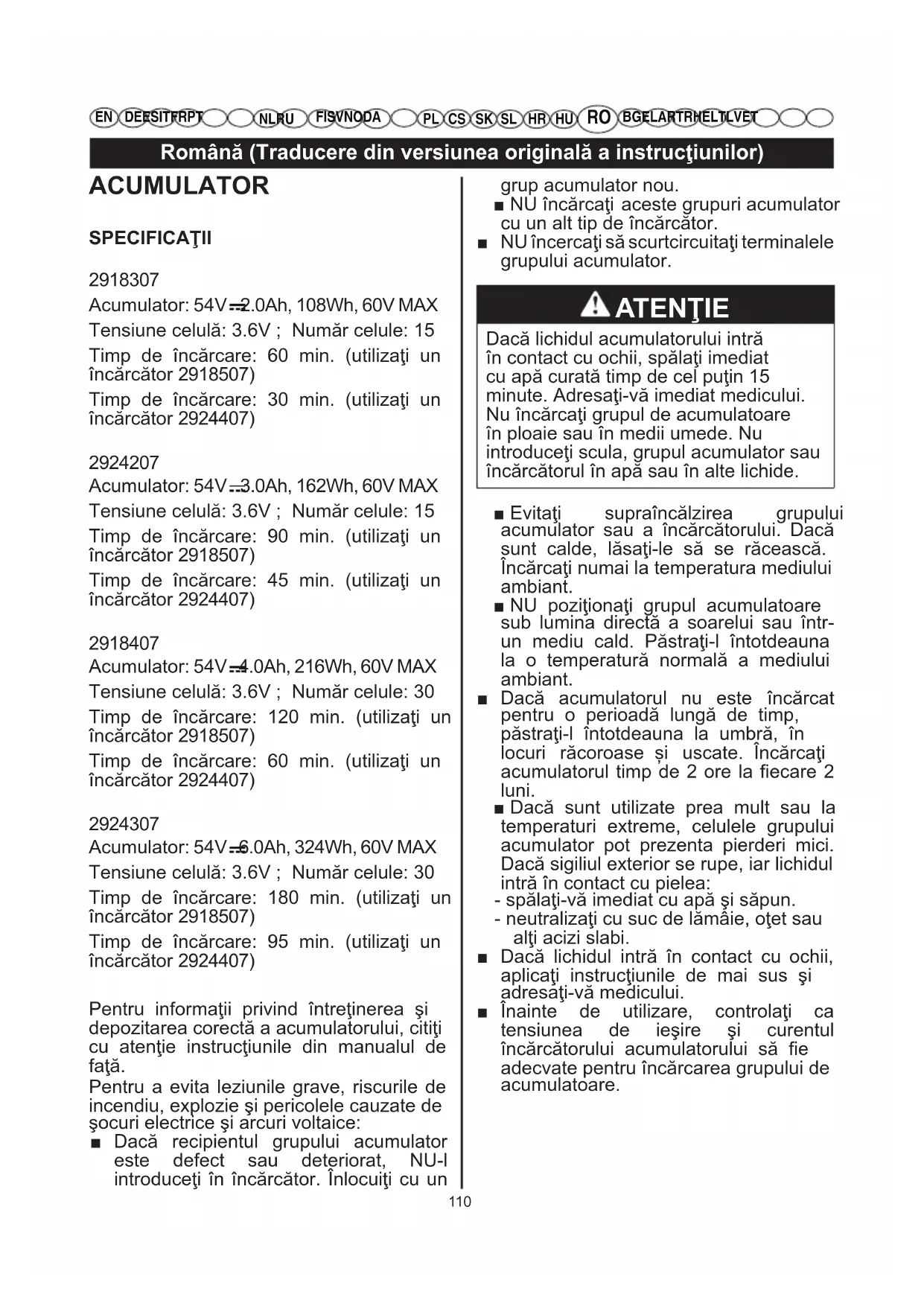 Acumulator: 54V 6.0Ah, 324Wh, 60V MAX Tensiune celulă: 3.6V ; Număr celule: 30 Timp de încărcare: 180 min. (utilizaţi un încărcător 2918507) Timp de încărcare: 95 min. (utilizaţi un încărcător 2924407) Pentru informaţii privind întreţinerea şi depozitarea corectă a acumulatorului, citiţi cu atenţie instrucţiunile din manualul de faţă. Pentru a evita leziunile grave, riscurile de incendiu, explozie şi pericolele cauzate de şocuri electrice şi arcuri voltaice: ■ Dacă recipientul grupului acumulator este defect sau deteriorat, NU-l introduceţi în încărcător. Înlocuiţi cu un grup acumulator nou. ■ NU încărcaţi aceste grupuri acumulator cu un alt tip de încărcător. ■ NU încercaţi să scurtcircuitaţi terminalele grupului acumulator. ATENŢIE Dacă lichidul acumulatorului intră în contact cu ochii, spălaţi imediat cu apă curată timp de cel puţin 15 minute. Adresaţi-vă imediat medicului. Nu încărcaţi grupul de acumulatoare în ploaie sau în medii umede. Nu introduceţi scula, grupul acumulator sau încărcătorul în apă sau în alte lichide. ■ Evitaţi supraîncălzirea grupului acumulator sau a încărcătorului. Dacă sunt calde, lăsaţi-le să se răcească. Încărcaţi numai la temperatura mediului ambiant. ■ NU poziţionaţi grupul acumulatoare sub lumina directă a soarelui sau într- un mediu cald. Păstraţi-l întotdeauna la o temperatură normală a mediului ambiant. ■ Dacă acumulatorul nu este încărcat pentru o perioadă lungă de timp, păstraţi-l întotdeauna la umbră, în locuri răcoroase și uscate. Încărcaţi acumulatorul timp de 2 ore la fiecare 2 luni. ■ Dacă sunt utilizate prea mult sau la temperaturi extreme, celulele grupului acumulator pot prezenta pierderi mici. Dacă sigiliul exterior se rupe, iar lichidul intră în contact cu pielea: - spălaţi-vă imediat cu apă şi săpun. - neutralizaţi cu suc de lămâie, oţet sau alţi acizi slabi. ■ Dacă lichidul intră în contact cu ochii, aplicaţi instrucţiunile de mai sus şi adresaţi-vă medicului. ■ Înainte de utilizare, controlaţi ca tensiunea de ieşire şi curentul încărcătorului acumulatorului să fie adecvate pentru încărcarea grupului de acumulatoare.Română (Traducere din versiunea originală a instrucţiunilor)