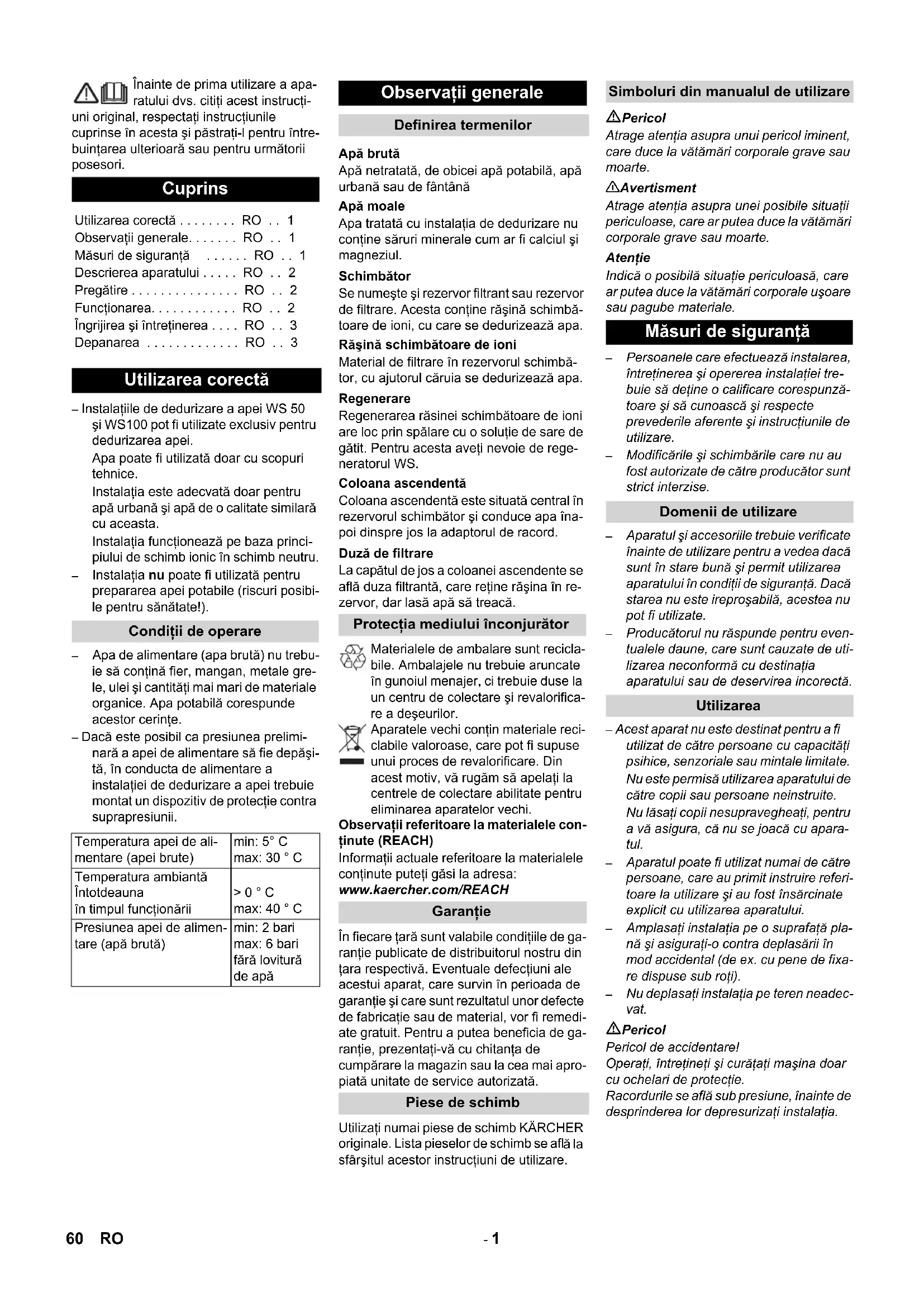 - 5 10,0 20,0 10 5,0 10,0 12 4,2 8,3 14 3,6 7,1 16 3,1 6,3 18 2,8 5,6 20 2,5 5,0 22 2,3 4,5 Czujnik zegarowy Regeneracja Regenerowanie wyczerpanych urządzeń Wymiana żywicy w zbiorniku. Czyszczenie i konserwacja Wskazówki ogólne Zagrożenie mrozem Opróżnić zbiornik w przypadku zagroże- nia mrozem 58 PL- 4 – Skontrolować szczelność instalacji. – Sprawdzić stan naładowania akumula- tora (wskaźnik akumulatora na ekranie czujnika zegarowego) wzgl. ją wymie- nić. Typ akumulatora CR2032. – Sprawdzić, ewent. wymienić pas mocu- jący. – Sprawdzić zanieczyszczenie świecy fil- tra, ewent. ją wymienić (nr katalogowy 6.761-361.0). – Nasmarować łożyska kół. – Sprawdzić węże i sprzęgła pod kątem uszkodzeń. Urządzenie wyczerpane Gdy dostępny jest regenerator WS: Podłączyć urządzenie do regeneratora WS i je zregenerować. Wymiana żywicy w zbiorniku (wymiennik). Uszkodzona dolna dysza przy rurze wznośnej Wymienić dyszę. Niewłaściwie założony adapter przyłą- czeniowy Dokręcić przejściówkę kluczem. Uszkodzona uszczelka Sprawdzić i wymienić. Prace konserwacyjne Codzienne kontrole przed pracą Konserwacja co 3 miesiące Pomoc w usuwaniu usterek Brak wody miękkiej Wydostawanie się żywicy Nieszczelność 59PL- 1 Înainte de prima utilizare a apa- ratului dvs. citiţi acest instrucţi- uni original, respectaţi instrucţiunile cuprinse în acesta şi păstraţi-l pentru între- buinţarea ulterioară sau pentru următorii posesori. – Instalaţiile de dedurizare a apei WS 50 şi WS100 pot fi utilizate exclusiv pentru dedurizarea apei. Apa poate fi utilizată doar cu scopuri tehnice. Instalaţia este adecvată doar pentru apă urbană şi apă de o calitate similară cu aceasta. Instalaţia funcţionează pe baza princi- piului de schimb ionic în schimb neutru. – Instalaţia nu poate fi utilizată pentru prepararea apei potabile (riscuri posibi- le pentru sănătate!). – Apa de alimentare (apa brută) nu trebu- ie să conţină fier, mangan, metale gre- le, ulei şi cantităţi mai mari de materiale organice. Apa potabilă corespunde acestor cerinţe. – Dacă este posibil ca presiunea prelimi- nară a apei de alimentare să fie depăşi- tă, în conducta de alimentare a instalaţiei de dedurizare a apei trebuie montat un dispozitiv de protecţie contra suprapresiunii. Apă netratată, de obicei apă potabilă, apă urbană sau de fântână Apa tratată cu instalaţia de dedurizare nu conţine săruri minerale cum ar fi calciul şi magneziul. Se numeşte şi rezervor filtrant sau rezervor de filtrare. Acesta conţine răşină schimbă- toare de ioni, cu care se dedurizează apa. Material de filtrare în rezervorul schimbă- tor, cu ajutorul căruia se dedurizează apa. Regenerarea răsinei schimbătoare de ioni are loc prin spălare cu o soluţie de sare de gătit. Pentru acesta aveţi nevoie de rege- neratorul WS. Coloana ascendentă este situată central în rezervorul schimbător şi conduce apa îna- poi dinspre jos la adaptorul de racord. La cap ătul de jos a coloanei ascendente se află duza filtrantă, care reţine răşina în re- zervor, dar lasă apă să treacă. Materialele de ambalare sunt recicla- bile. Ambalajele nu trebuie aruncate în gunoiul menajer, ci trebuie duse la un centru de colectare şi revalorifica- re a deşeurilor. Aparatele vechi conţin materiale reci- clabile valoroase, care pot fi supuse unui proces de revalorificare. Din acest motiv, vă rugăm să apelaţi la centrele de colectare abilitate pentru eliminarea aparatelor vechi. Observaţii referitoare la materialele con- ţinute (REACH) Informaţii actuale referitoare la materialele conţinute puteţi găsi la adresa: www.kaercher.com/REACH În fiecare ţară sunt valabile condiţiile de ga- ranţie publicate de distribuitorul nostru din ţara respectivă. Eventuale defecţiuni ale acestui aparat, care survin în perioada de garanţie şi care sunt rezultatul unor defecte de fabricaţie sau de material, vor fi remedi- ate gratuit. Pentru a putea beneficia de ga- ranţie, prezentaţi-vă cu chitanţa de cumpărare la magazin sau la cea mai apro- piată unitate de service autorizată. Utilizaţi numai piese de schimb KÄRCHER originale. Lista pieselor de schimb se afl ă la sfârşitul acestor instrucţiuni de utilizare. Pericol Atrage atenţia asupra unui pericol iminent, care duce la vătămări corporale grave sau moarte. 몇 Avertisment Atrage atenţia asupra unei posibile situaţii periculoase, care ar putea duce la vătămări corporale grave sau moarte. Atenţie Indică o posibilă situaţie periculoasă, care ar putea duce la vătămări corporale uşoare sau pagube materiale. – Persoanele care efectuează instalarea, întreţinerea şi opererea instalaţiei tre- buie să deţine o calificare corespunză- toare şi să cunoască şi respecte prevederile aferente şi instrucţiunile de utilizare. – Modificările şi schimbările care nu au fost autorizate de către producător sunt strict interzise. – Aparatul şi accesoriile trebuie verificate înainte de utilizare pentru a vedea dacă sunt în stare bună şi permit utilizarea aparatului în condiţii de siguranţă. Dacă starea nu este ireproşabilă, acestea nu pot fi utilizate. – Producătorul nu răspunde pentru even- tualele daune, care sunt cauzate de uti- lizarea neconformă cu destinaţia aparatului sau de deservirea incorectă. – Acest aparat nu este destinat pentru a fi utilizat de către persoane cu capacităţi psihice, senzoriale sau mintale limitate. Nu este permisă utilizarea aparatului de către copii sau persoane neinstruite. Nu lăsaţi copii nesupravegheaţi, pentru a vă asigura, că nu se joacă cu apara- tul. – Aparatul poate fi utilizat numai de către persoane, care au primit instruire referi- toare la utilizare şi au fost însărcinate explicit cu utilizarea aparatului. – Amplasaţi instalaţia pe o suprafaţă pla- nă şi asiguraţi-o contra depla