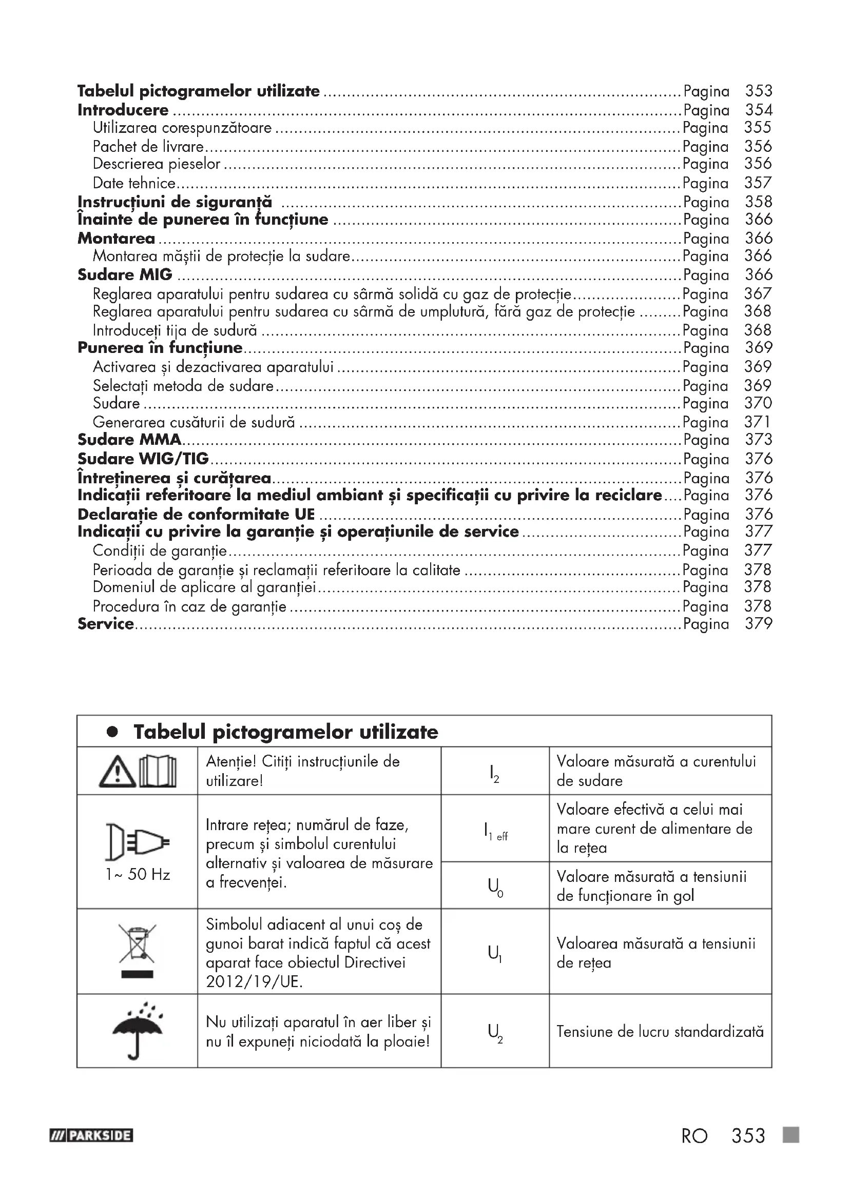 Tensiune de lucru standardizată Tabelul pictogramelor utilizate ............................................................................Pagina 353 Introducere ............................................................................................................Pagina 354 Utilizarea corespunzătoare ......................................................................................Pagina 355 Pachet de livrare .....................................................................................................Pagina 356 Descrierea pieselor .................................................................................................Pagina 356 Date tehnice ...........................................................................................................Pagina 357 Instrucțiuni de siguranță .....................................................................................Pagina 358 Înainte de punerea în funcțiune ..........................................................................Pagina 366 Montarea ...............................................................................................................Pagina 366 Montarea măștii de protecție la sudare ......................................................................Pagina 366 Sudare MIG ...........................................................................................................Pagina 366 Reglarea aparatului pentru sudarea cu sârmă solidă cu gaz de protecție .......................Pagina 367 Reglarea aparatului pentru sudarea cu sârmă de umplutură, fără gaz de protecție .........Pagina 368 Introduceți tija de sudură .........................................................................................Pagina 368 Punerea în funcțiune .............................................................................................Pagina 369 Activarea și dezactivarea aparatului .........................................................................Pagina 369 Selectați metoda de sudare ...................................................................................... Pagina 369 Sudare ..................................................................................................................Pagina 370 Generarea cusăturii de sudură .................................................................................Pagina 371 Sudare MMA..........................................................................................................Pagina 373 Sudare WIG/TIG ....................................................................................................Pagina 376 Întreținerea și curățarea .......................................................................................Pagina 376 Indicații referitoare la mediul ambiant și specificații cu privire la reciclare .... Pagina 376 Declarație de conformitate UE .............................................................................Pagina 376 Indicații cu privire la garanție și operațiunile de service ..................................Pagina 377 Condiții de garanție ................................................................................................ Pagina 377 Perioada de garanție și reclamații referitoare la calitate ..............................................Pagina 378 Domeniul de aplicare al garanției .............................................................................Pagina 378 Procedura în caz de garanție ...................................................................................Pagina 378 Service....................................................................................................................Pagina 379354
