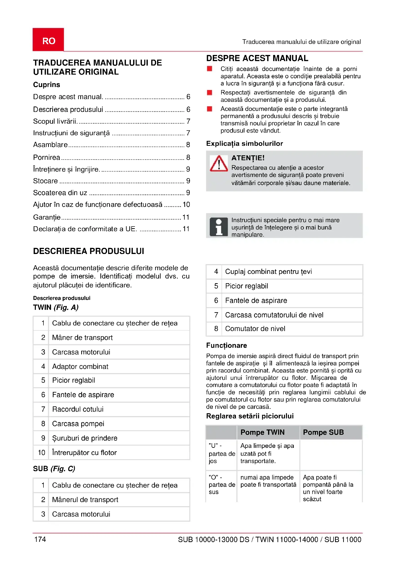 Citiți această documentație înainte de a porni aparatul. Aceasta este o condiție prealabilă pentru a lucra în siguranță și a funcționa fără cusur. Respectați avertismentele de siguranță din această documentație și a produsului. Această documentație este o parte integrantă permanentă a produsului descris și trebuie transmisă noului proprietar în cazul în care produsul este vândut. Explicația simbolurilor DESCRIEREA PRODUSULUI Această documentație descrie diferite modele de pompe de imersie. Identificați modelul dvs. cu ajutorul plăcuței de identificare. Descrierea produsului TWIN (Fig. A)