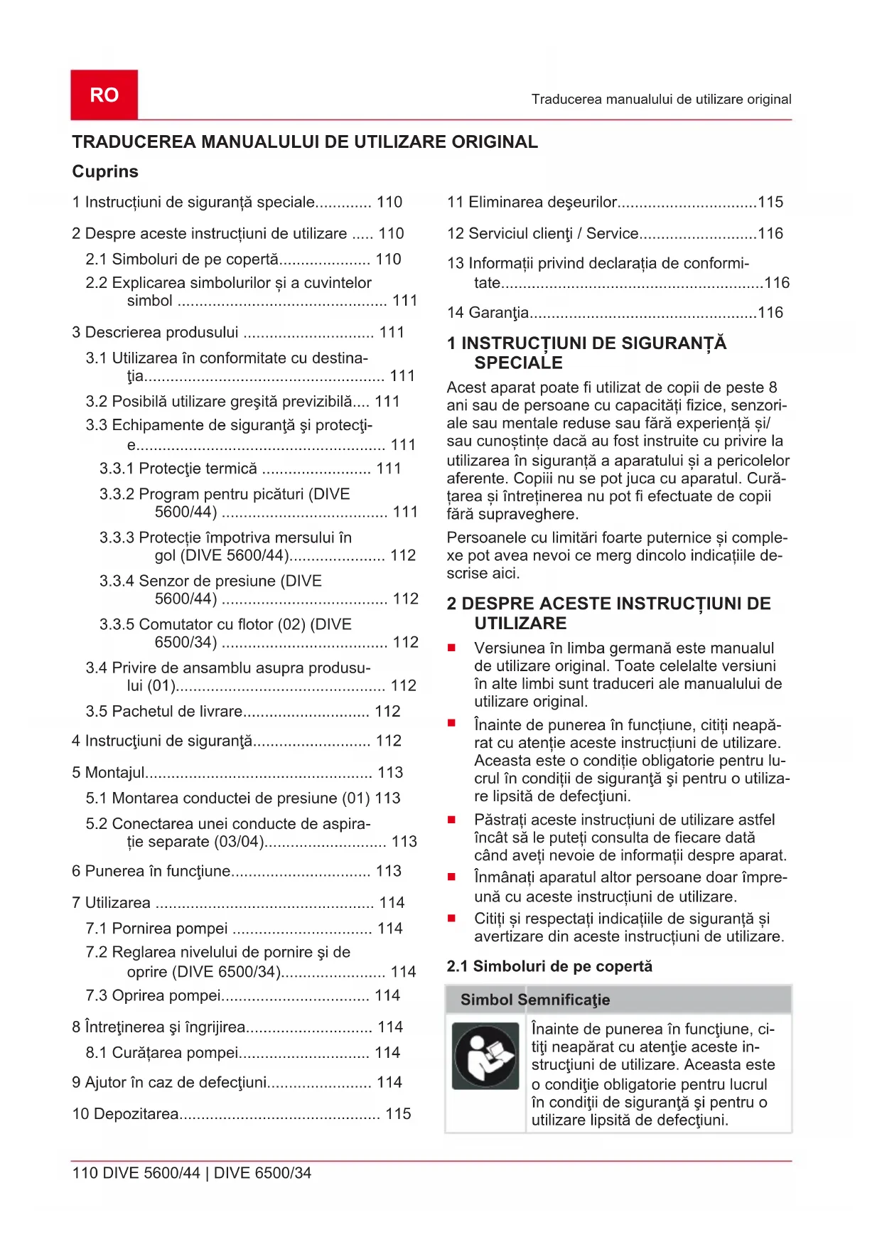 Cuprins 1 Instrucțiuni de siguranță speciale............. 110 2 Despre aceste instrucțiuni de utilizare ..... 110