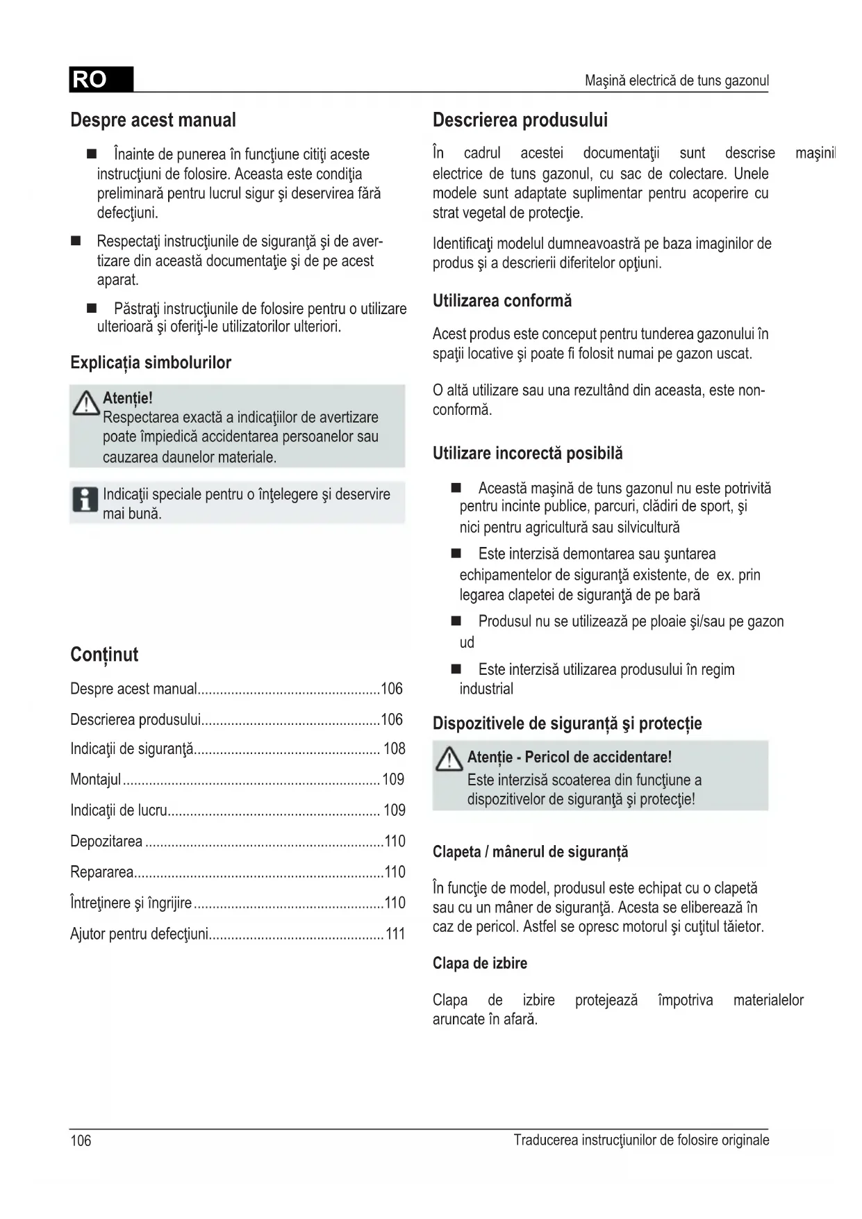 - Maşină electrică de tuns gazonul Conţinut Despre acest manual p. 106