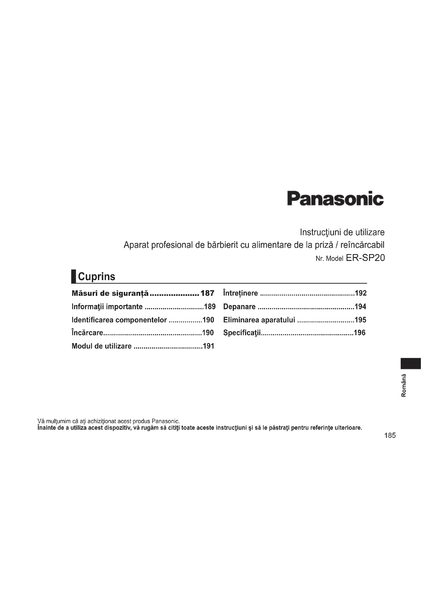 - Pentruprotecţiamediuluişireciclareamaterialelor Acest aparat conţine un acumulator litiu-ion. Asiguraţi-vă că acumulatorul este eliminat la un centru desemnat ocial, dacă există unul în ţara dumneavoastră.196 Română Specicaţii Sursa de alimentare Consultaţi plăcuţa de identicare de pe adaptorul c.a. (conversie automată a tensiunii) Tensiunea motorului 3,6 V Timp de încărcare Aprox. 1 oră Pentru informații suplimentare privind eciența energetică a produsului vă rugăm vizitați site-ul nostru internet www.panasonic. com introducând numărul de model în masca de căutare. Depunerealadeşeuriaechipamentelorşiabateriilorvechi DoarpentruUniuneaEuropeanăşipentruţărilecusistemedereciclare Aceste simboluri de pe produse, ambalaje şi/sau documentele însoţitoare indică faptul că produsele electrice şi electronice, precum şi bateriile uzate nu trebuie să e amestecate cu deşeurile menajere obişnuite. Pentru un tratament corespunzător, pentru recuperarea şi reciclarea produselor vechi şi a bateriilor uzate, vă rugăm să le depuneţi la punctele de colectare special amenajate, în conformitate cu legislaţia naţională. Prin depunerea corespunzătoare a acestora la deşeuri, veţi ajuta la economisirea unor resurse valoroase şi veţi preveni potenţiale efecte negative asupra sănătăţii umane şi asupra mediului înconjurător. Pentru mai multe informaţii despre colectare şi reciclare, vă rugăm să contactaţi autorităţile locale. Este posibil ca depunerea incorectă la deşeuri să e pedepsită în conformitate cu legile naţionale. Notăpentrusimboluldebaterie(ultimeledouă exemple de simboluri) Acest simbol poate utilizat în combinaţie cu un simbol chimic. În acest caz, acesta este conform cu cerinţele stabilite de Directiva pentru elementul chimic în cauză. Importator: Panasonic Marketing Europe GmbH ReprezentantautorizatînUE: Panasonic Testing Centre Winsbergring 15, 22525 Hamburg, Germania Fabricat de: Panasonic Corporation 1006, Oaza Kadoma, Kadoma City, Osaka, Japonia197 Türkçe Kullanım Talimatları AC/Şarj Edilebilir Profesyonel Traş Makinesi Model No. ER‑SP20 Bu Panasonic ürününü aldığınız için teşekkür ederiz. Buüniteyikullanmadanöncelütfentalimatlarıeksiksizokuyunveileridekullanmakiçinsaklayın. Güvenlik önlemleri p. 199
