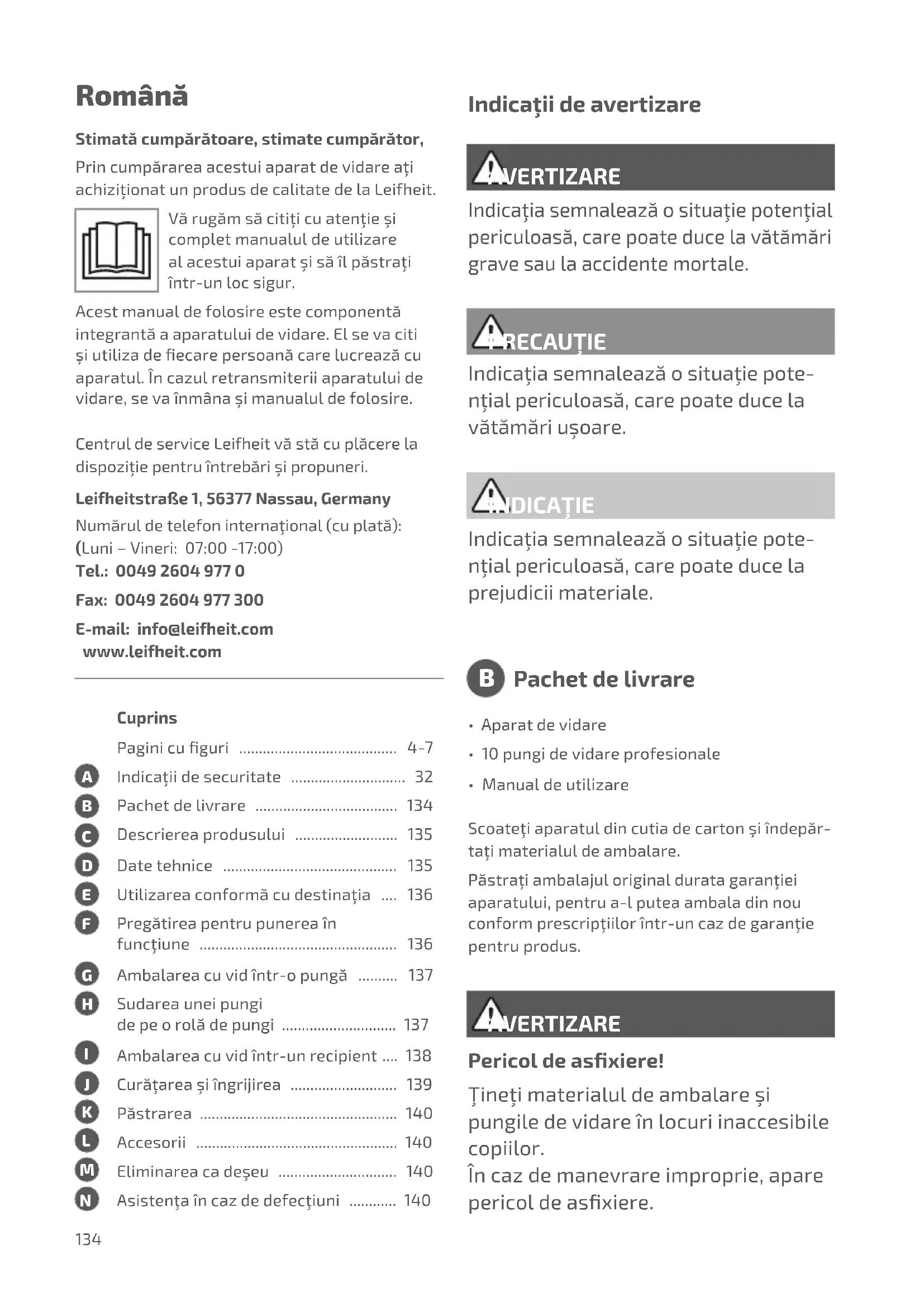 - Убедитесь, что края контейнера достаточ- но чистые. Если все вышеперечисленные варианты исключены, обратитесь в сер- висный центр по указанному адресу. RUS134 Cuprins Pagini cu guri ........................................ 4-7 Indicaţii de securitate ............................. 32 Pachet de livrare .................................... 134 Descrierea produsului .......................... 135 Date tehnice ............................................ 135 Utilizarea conformă cu destinaţia .... 136 Pregătirea pentru punerea în funcţiune .................................................. 136 Ambalarea cu vid într-o pungă .......... 137 Sudarea unei pungi de pe o rolă de pungi ............................. 137 Ambalarea cu vid într-un recipient .... 138 Curăţarea şi îngrijirea ........................... 139 Păstrarea .................................................. 140 Accesorii ................................................... 140 Eliminarea ca deşeu .............................. 140 Asistenţa în caz de defecţiuni ............ 140 Română Stimată cumpărătoare, stimate cumpărător, Prin cumpărarea acestui aparat de vidare aţi achiziţionat un produs de calitate de la Leifheit. Vă rugăm să citiţi cu atenţie şi complet manualul de utilizare al acestui aparat şi să îl păstraţi într-un loc sigur. Acest manual de folosire este componentă integrantă a aparatului de vidare. El se va citi şi utiliza de ecare persoană care lucrează cu aparatul. În cazul retransmiterii aparatului de vidare, se va înmâna şi manualul de folosire. AVERTIZARE AVERTIZARE Indicaţii de avertizare Indicaţia semnalează o situaţie potenţial periculoasă, care poate duce la vătămări grave sau la accidente mortale. Pericol de asxiere! Ţineţi materialul de ambalare şi pungile de vidare în locuri inaccesibile copiilor. În caz de manevrare improprie, apare pericol de asxiere.