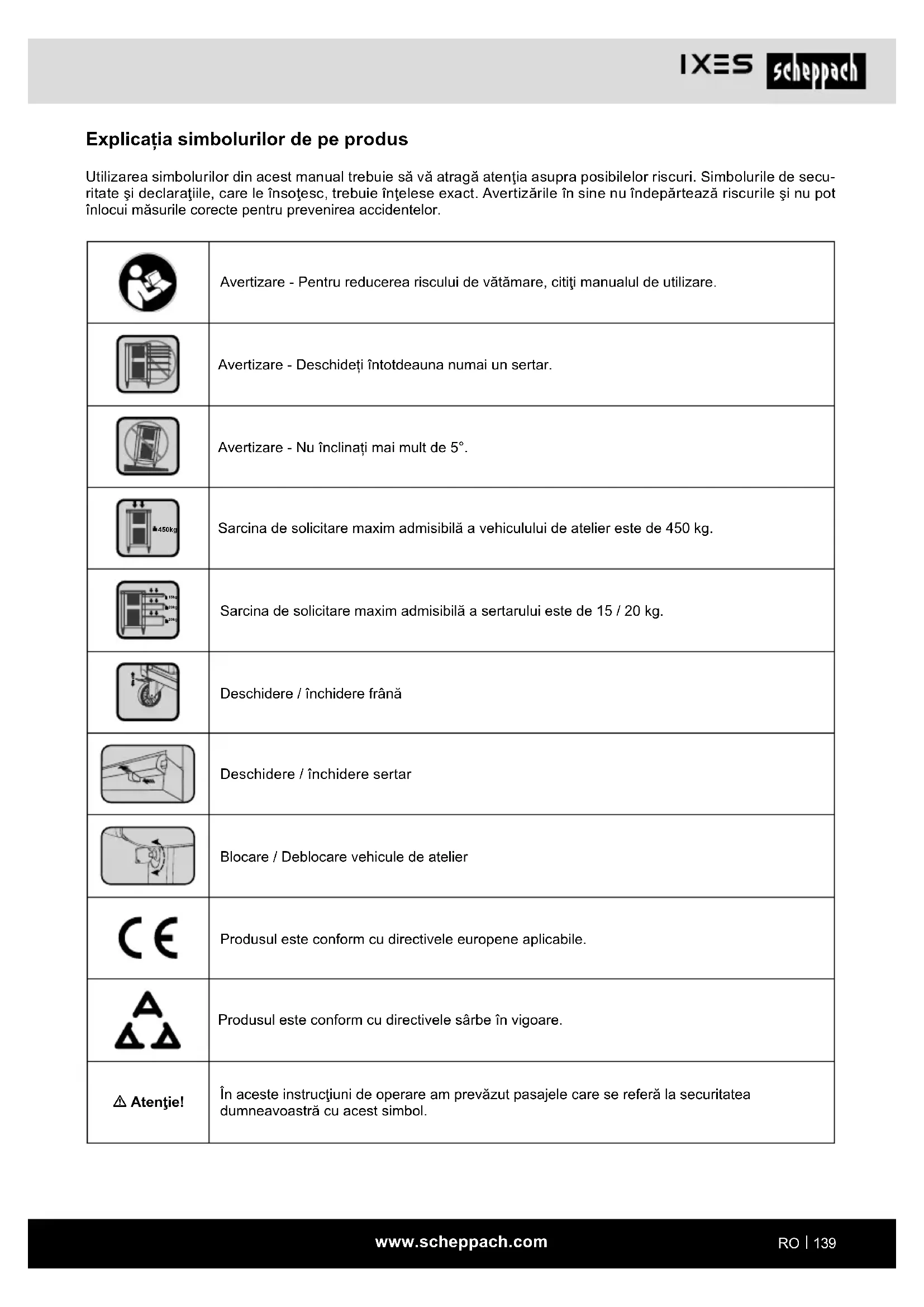 Explicația simbolurilor de pe produs Utilizarea simbolurilor din acest manual trebuie să vă atragă atenţia asupra posibilelor riscuri. Simbolurile de secu- ritate şi declaraţiile, care le însoţesc, trebuie înţelese exact. Avertizările în sine nu îndepărtează riscurile şi nu pot înlocui măsurile corecte pentru prevenirea accidentelor. Avertizare - Pentru reducerea riscului de vătămare, citiţi manualul de utilizare. Avertizare - Deschideți întotdeauna numai un sertar. Avertizare - Nu înclinați mai mult de 5°. 450kg Sarcina de solicitare maxim admisibilă a vehiculului de atelier este de 450 kg. 15kg 20kg 20kg Sarcina de solicitare maxim admisibilă a sertarului este de 15 / 20 kg. Deschidere / închidere frână Deschidere / închidere sertar Blocare / Deblocare vehicule de atelier Produsul este conform cu directivele europene aplicabile. Produsul este conform cu directivele sârbe în vigoare. m Atenţie! În aceste instrucţiuni de operare am prevăzut pasajele care se referă la securitatea dumneavoastră cu acest simbol.www.scheppach.com