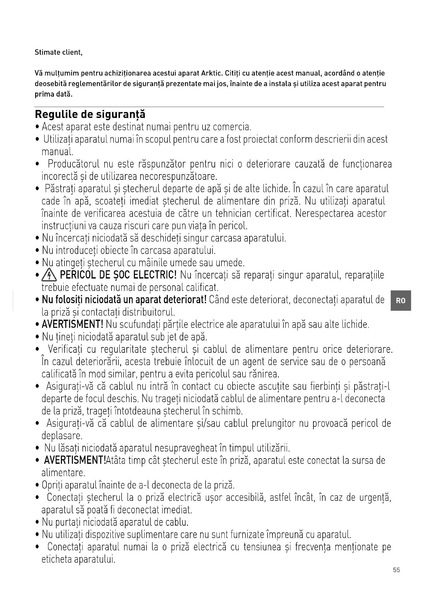 Stimate client, Vă mulțumim pentru achiziționarea acestui aparat Arktic. Citiți cu atenție acest manual, acordând o atenție deosebită reglementărilor de siguranță prezentate mai jos, înainte de a instala și utiliza acest aparat pentru prima dată. Regulile de siguranță
