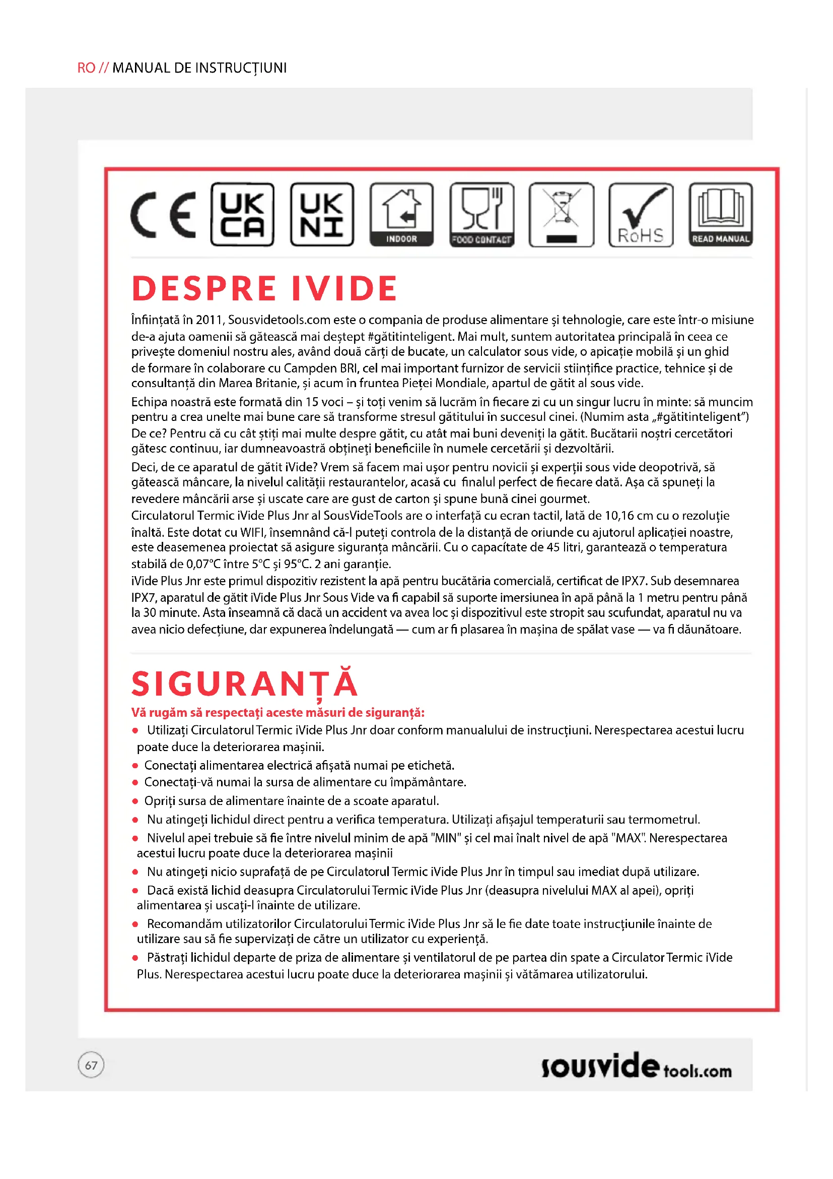Ημερομηνία / Τόπος Ονομα: Alex Shannon Θέση: Διευθύνων Σύμβουλος GR // ΟΔΗΓΙΕΣ ΧΡΗΣΗΣ67 DESPRE IVIDE SIGURANȚĂ Înințată în 2011, Sousvidetools.com este o compania de produse alimentare și tehnologie, care este într-o misiune de-a ajuta oamenii să gătească mai deștept #gătitinteligent. Mai mult, suntem autoritatea principală în ceea ce privește domeniul nostru ales, având două cărți de bucate, un calculator sous vide, o apicație mobilă și un ghid de formare în colaborare cu Campden BRI, cel mai important furnizor de servicii stiințice practice, tehnice și de consultanță din Marea Britanie, și acum în fruntea Pieței Mondiale, apartul de gătit al sous vide. Echipa noastră este formată din 15 voci – și toți venim să lucrăm în ecare zi cu un singur lucru în minte: să muncim pentru a crea unelte mai bune care să transforme stresul gătitului în succesul cinei. (Numim asta „#gătitinteligent”) De ce? Pentru că cu cât știți mai multe despre gătit, cu atât mai buni deveniți la gătit. Bucătarii noștri cercetători gătesc continuu, iar dumneavoastră obțineți beneciile în numele cercetării și dezvoltării. Deci, de ce aparatul de gătit iVide? Vrem să facem mai ușor pentru novicii și experții sous vide deopotrivă, să gătească mâncare, la nivelul calității restaurantelor, acasă cu nalul perfect de ecare dată. Așa că spuneți la revedere mâncării arse și uscate care are gust de carton și spune bună cinei gourmet. Circulatorul Termic iVide Plus Jnr al SousVideTools are o interfață cu ecran tactil, lată de 10,16 cm cu o rezoluție înaltă. Este dotat cu WIFI, însemnând că-l puteți controla de la distanță de oriunde cu ajutorul aplicației noastre, este deasemenea proiectat să asigure siguranța mâncării. Cu o capacítate de 45 litri, garantează o temperatura stabilă de 0,07°C între 5°C și 95°C. 2 ani garanție. iVide Plus Jnr este primul dispozitiv rezistent la apă pentru bucătăria comercială, certicat de IPX7. Sub desemnarea IPX7, aparatul de gătit iVide Plus Jnr Sous Vide va capabil să suporte imersiunea în apă până la 1 metru pentru până la 30 minute. Asta înseamnă că dacă un accident va avea loc și dispozitivul este stropit sau scufundat, aparatul nu va avea nicio defecțiune, dar expunerea îndelungată — cum ar plasarea în mașina de spălat vase — va dăunătoare. Vă rugăm să respectați aceste măsuri de siguranță: