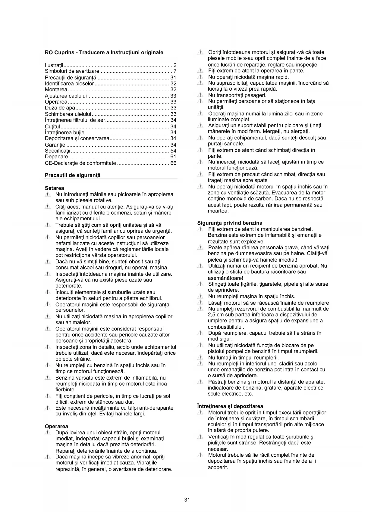 - CE-Declarație de conformitate Precauţii de siguranţă Setarea Nu introduceţi mâinile sau picioarele în apropierea sau sub piesele rotative. Citiţi acest manual cu atenţie. Asiguraţi-vă că v-aţi familiarizat cu diferitele comenzi, setări şi mânere ale echipamentului. Trebuie să ştiţi cum să opriţi unitatea şi să vă asiguraţi că sunteţi familiar cu oprirea de urgenţă. Nu permiteţi niciodată copiilor sau persoanelor nefamiliarizate cu aceste instrucţiuni să utilizeze maşina. Aveţi în vedere că reglementările locale pot restricţiona vârsta operatorului. Dacă nu vă simţiţi bine, sunteţi obosit sau aţi consumat alcool sau droguri, nu operaţi maşina. Inspectaţi întotdeauna maşina înainte de utilizare. Asiguraţi-vă că nu există piese uzate sau deteriorate. Înlocuiţi elementele şi şuruburile uzate sau deteriorate în seturi pentru a păstra echilibrul. Operatorul maşinii este responsabil de siguranţa persoanelor. Nu utilizaţi niciodată maşina în apropierea copiilor sau animalelor. Operatorul maşinii este considerat responsabil pentru orice accidente sau pericole cauzate altor persoane şi proprietăţii acestora. Inspectaţi zona în detaliu, acolo unde echipamentul trebuie utilizat, dacă este necesar, îndepărtaţi orice obiecte străine. Nu reumpleţi cu benzină în spaţiu închis sau în timp ce motorul funcţionează. Benzina vărsată este extrem de inflamabilă, nu reumpleţi niciodată în timp ce motorul este încă fierbinte. Fiţi conştient de pericole, în timp ce lucraţi pe sol dificil, extrem de stâncos sau dur. Este necesară încălţăminte cu tălpi anti-derapante cu înveliş din oţel. Evitaţi hainele largi. Operarea După lovirea unui obiect străin, opriţi motorul imediat, îndepărtaţi capacul bujiei şi examinaţi maşina în detaliu dacă prezintă deteriorări. Reparaţi deteriorările înainte de a continua. Dacă maşina începe să vibreze anormal, opriţi motorul şi verificaţi imediat cauza. Vibraţiile reprezintă, în general, o avertizare de deteriorare. Opriţi întotdeauna motorul şi asiguraţi-vă că toate piesele mobile s-au oprit complet înainte de a face orice lucrări de reparaţie, reglare sau inspecţie. Fiţi extrem de atent la operarea în pante. Nu operaţi niciodată maşina rapid. Nu suprasolicitaţi capacitatea maşinii, încercând să lucraţi la o viteză prea rapidă. Nu transportaţi pasageri. Nu permiteţi persoanelor să staţioneze în faţa unităţii. Operaţi maşina numai la lumina zilei sau în zone iluminate complet. Asiguraţi un suport stabil pentru picioare şi ţineţi mânerele în mod ferm. Mergeţi, nu alergaţi. Nu operaţi echipamentul, dacă sunteţi desculţ sau purtaţi sandale. Fiţi extrem de atent când schimbaţi direcţia în pante. Nu încercaţi niciodată să faceţi ajustări în timp ce motorul funcţionează. Fiţi extrem de precaut când schimbaţi direcţia sau trageţi maşina spre spate Nu operaţi niciodată motorul în spaţiu închis sau în zone cu ventilaţie scăzută. Evacuarea de la motor conţine monoxid de carbon. Dacă nu se respectă acest fapt, poate rezulta rănirea permanentă sau moartea. Siguranţa privind benzina Fiţi extrem de atent la manipularea benzinei. Benzina este extrem de inflamabilă şi emanaţiile rezultate sunt explozive. Poate apărea rănirea personală gravă, când vărsaţi benzina pe dumneavoastră sau pe haine. Clătiţi-vă pielea şi schimbaţi-vă hainele imediat! Utilizaţi numai un recipient de benzină aprobat. Nu utilizaţi o sticlă de băutură răcoritoare sau asemănătoare! Stingeţi toate ţigările, ţigaretele, pipele şi alte surse de aprindere. Nu reumpleţi maşina în spaţiu închis. Lăsaţi motorul să se răcească înainte de reumplere Nu umpleţi rezervorul de combustibil la mai mult de 2,5 cm sub partea inferioară a dispozitivului de umplere pentru a asigura spaţiu de expansiune a combustibilului. După reumplere, capacul trebuie să fie strâns în mod sigur. Nu utilizaţi niciodată funcţia de blocare de pe pistolul pompei de benzină în timpul reumplerii. Nu fumaţi în timpul reumplerii. Nu reumpleţi în interiorul unei clădiri sau acolo unde emanaţiile de benzină pot intra în contact cu o sursă de aprindere. Păstraţi benzina şi motorul la distanţă de aparate, indicatoare de benzină, grătare, aparate electrice, scule electrice, etc. Întreţinerea şi depozitarea Motorul trebuie oprit în timpul executării operaţiilor de întreţinere şi curăţare, în timpul schimbării sculelor şi în timpul transportării prin alte mijloace în afară de propria putere. Verificaţi în mod regulat că toate şuruburile şi piuliţele sunt strânse. Restrângeţi dacă este necesar. Motorul trebuie să fie răcit complet înainte de depozitarea în spaţiu închis sau înainte de a fi acoperit.32 Dacă maşina este neutilizată o anumită perioadă de timp, vă rugăm să consultaţi instrucţiunile din acest manual. Întreţineţi sau înlocuiţi etichetele de siguranţă şi cu instrucţiuni, dacă este necesar. Utilizaţi numai piese de schimb şi accesorii originale. Dacă nu se utilizează piese sau accesorii originale, răspunderea nu se mai aplică. Diverse Motorul nu este pre-umplut cu ulei. Dispozitivele de control montate din fabrică, precum cablul de ambreiaj montat pe mâner, nu trebuie îndepărtat sau expus. Goliţi rezervorul de combustibil numai în aer liber. Benzina este extrem de inflamabilă şi emanaţiile rezultate sunt explozive. Asiguraţi-vă că maşina este asigurată corect când este transportată pe o platformă etc. Produsele electrice uzate nu trebuie aruncate la gunoiul menajer. Acest dispozitiv trebuie predat la un centru de reciclare pentru procesarea sigură. Maşina de tuns iarba a fost fabricată conform celor mai recente cerinţe de siguranţă. Acestea includ o frână a cuţitului care opreşte motorul şi cuţit