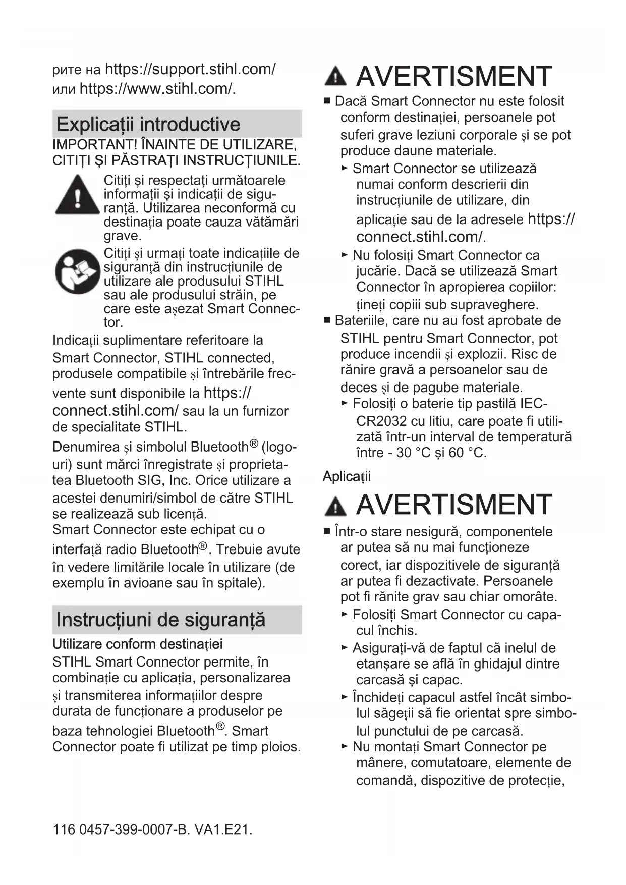 Поддръжка за продукта и помощ за употребата Поддръжка за продукта и помощ за употребата можете да получите в специализиран търговски обект на STIHL. Възможности за контакт и допълни‐ телна информация можете да наме‐ 0457-399-0007-B. VA1.E21. 115рите на https://support.stihl.com/ или https://www.stihl.com/. Explicaţii introductive IMPORTANT! ÎNAINTE DE UTILIZARE, CITIŢI ŞI PĂSTRAŢI INSTRUCŢIUNILE. Citiţi şi respectaţi următoarele informaţii şi indicaţii de sigu‐ ranţă. Utilizarea neconformă cu destinația poate cauza vătămări grave. Citiți și urmați toate indicațiile de siguranță din instrucțiunile de utilizare ale produsului STIHL sau ale produsului străin, pe care este așezat Smart Connec‐ tor. Indicații suplimentare referitoare la Smart Connector, STIHL connected, produsele compatibile și întrebările frec‐ vente sunt disponibile la https:// connect.stihl.com/ sau la un furnizor de specialitate STIHL. Denumirea și simbolul Bluetooth