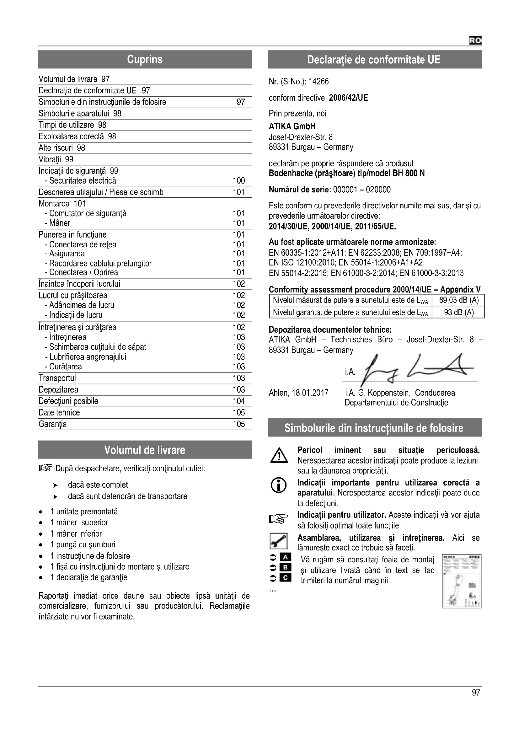 Declaraţie de conformitate UE Nr. (S-No.): 14266 conform directive: 2006/42/UE Prin prezenta, noi ATIKA GmbH Josef-Drexler-Str. 8 89331 Burgau – Germany declarăm pe proprie răspundere că produsul Bodenhacke (prăşitoare) tip/model BH 800 N Numărul de serie: 000001 – 020000 Este conform cu prevederile directivelor numite mai sus, dar şi cu prevederile următoarelor directive: 2014/30/UE, 2000/14/UE, 2011/65/UE. Au fost aplicate următoarele norme armonizate: EN 60335-1:2012+A11; EN 62233:2008; EN 709:1997+A4; EN ISO 12100:2010; EN 55014-1:2006+A1+A2; EN 55014-2:2015; EN 61000-3-2:2014; EN 61000-3-3:2013 Conformity assessment procedure 2000/14/UE – Appendix V Nivelul măsurat de putere a sunetului este de L