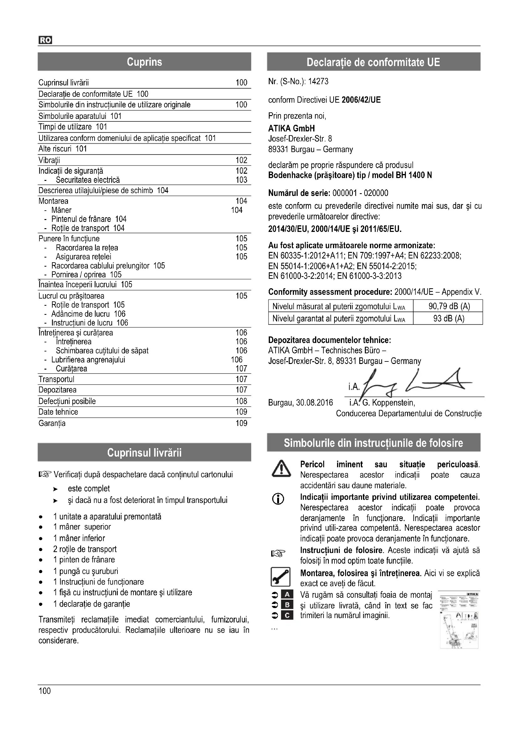 declarăm pe proprie răspundere că produsul Bodenhacke (prăşitoare) tip / model BH 1400 N Numărul de serie: 000001 - 020000 este conform cu prevederile directivei numite mai sus, dar şi cu prevederile următoarelor directive: 2014/30/EU, 2000/14/UE şi 2011/65/EU. Au fost aplicate următoarele norme armonizate: EN 60335-1:2012+A11; EN 709:1997+A4; EN 62233:2008; EN 55014-1:2006+A1+A2; EN 55014-2:2015; EN 61000-3-2:2014; EN 61000-3-3:2013 Conformity assessment procedure: 2000/14/UE – Appendix V. Nivelul măsurat al puterii zgomotului L