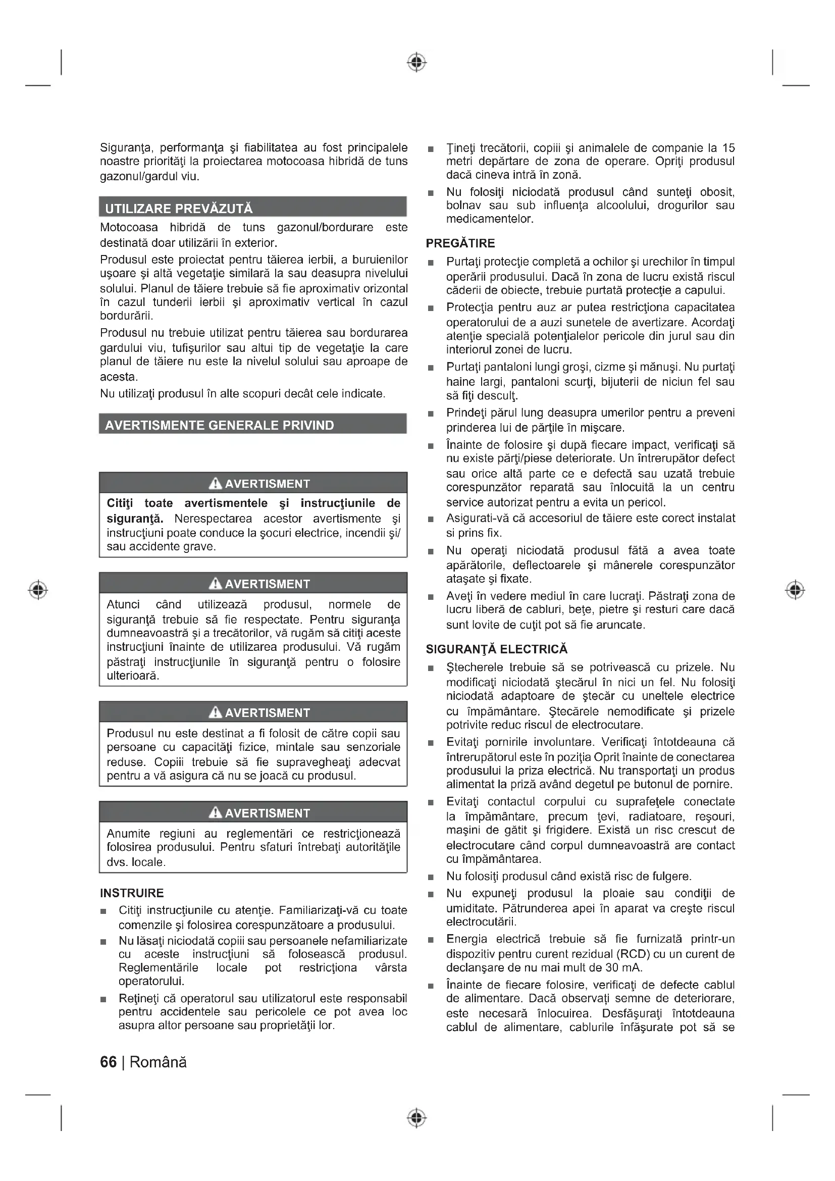Motocoasa hibridă de tuns gazonul/bordurare este destinată doar utilizării în exterior. Produsul este proiectat pentru tăierea ierbii, a buruienilor uşoare şi altă vegetaţie similară la sau deasupra nivelului solului. Planul de tăiere trebuie să fi e aproximativ orizontal în cazul tunderii ierbii şi aproximativ vertical în cazul bordurării. Produsul nu trebuie utilizat pentru tăierea sau bordurarea gardului viu, tufi şurilor sau altui tip de vegetaţie la care planul de tăiere nu este la nivelul solului sau aproape de acesta. Nu utilizaţi produsul în alte scopuri decât cele indicate.