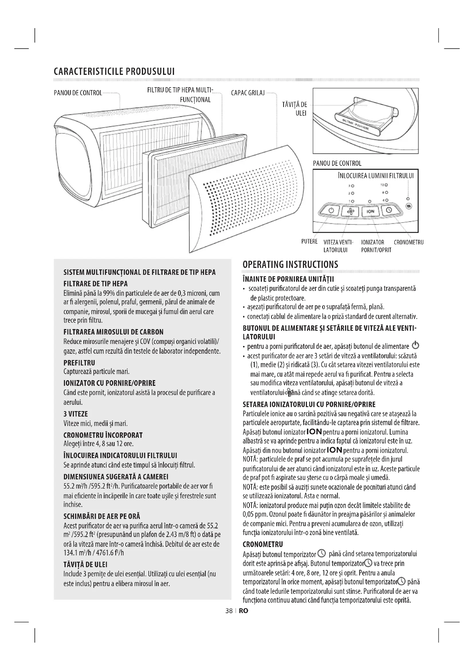 Particulele ionice au o sarcină pozitivă sau negativă care se ataează la particulele aeropurtate, facilitându-le captarea prin sistemul de ltrare. Apăsai butonul ionizator ION pentru a porni ionizatorul. Lumina albastră se va aprinde pentru a indica faptul că ionizatorul este în uz. Apăsai din nou butonul ionizator ION pentru a porni ionizatorul. NOTĂ: particulele de praf se pot acumula pe suprafeele din jurul puricatorului de aer atunci când ionizatorul este în uz. Aceste particule de praf pot aspirate sau terse cu o cârpă moale i umedă. NOTĂ: este posibil să auzii sunete ocazionale de pocnituri atunci când se utilizează ionizatorul. Asta e normal. NOTĂ: ionizatorul produce mai puin ozon decât limitele stabilite de 0,05 ppm. Ozonul poate dăunător în preajma păsărilor i animalelor de companie mici. Pentru a preveni acumularea de ozon, utilizai funcia ionizatorului într-o zonă bine ventilată. CRONOMETRU Apăsai butonul temporizator până când setarea temporizatorului dorit este aprinsă pe aaj. Butonul temporizator va trece prin următoarele setări: 4 ore, 8 ore, 12 ore i oprit. Pentru a anula temporizatorul în orice moment, apăsai butonul temporizator până când toate ledurile temporizatorului sunt stinse. Puricatorul de aer va funciona continuu atunci când funcia temporizatorului este oprită. SISTEM MULTIFUNCȚIONAL DE FILTRARE DE TIP HEPA
