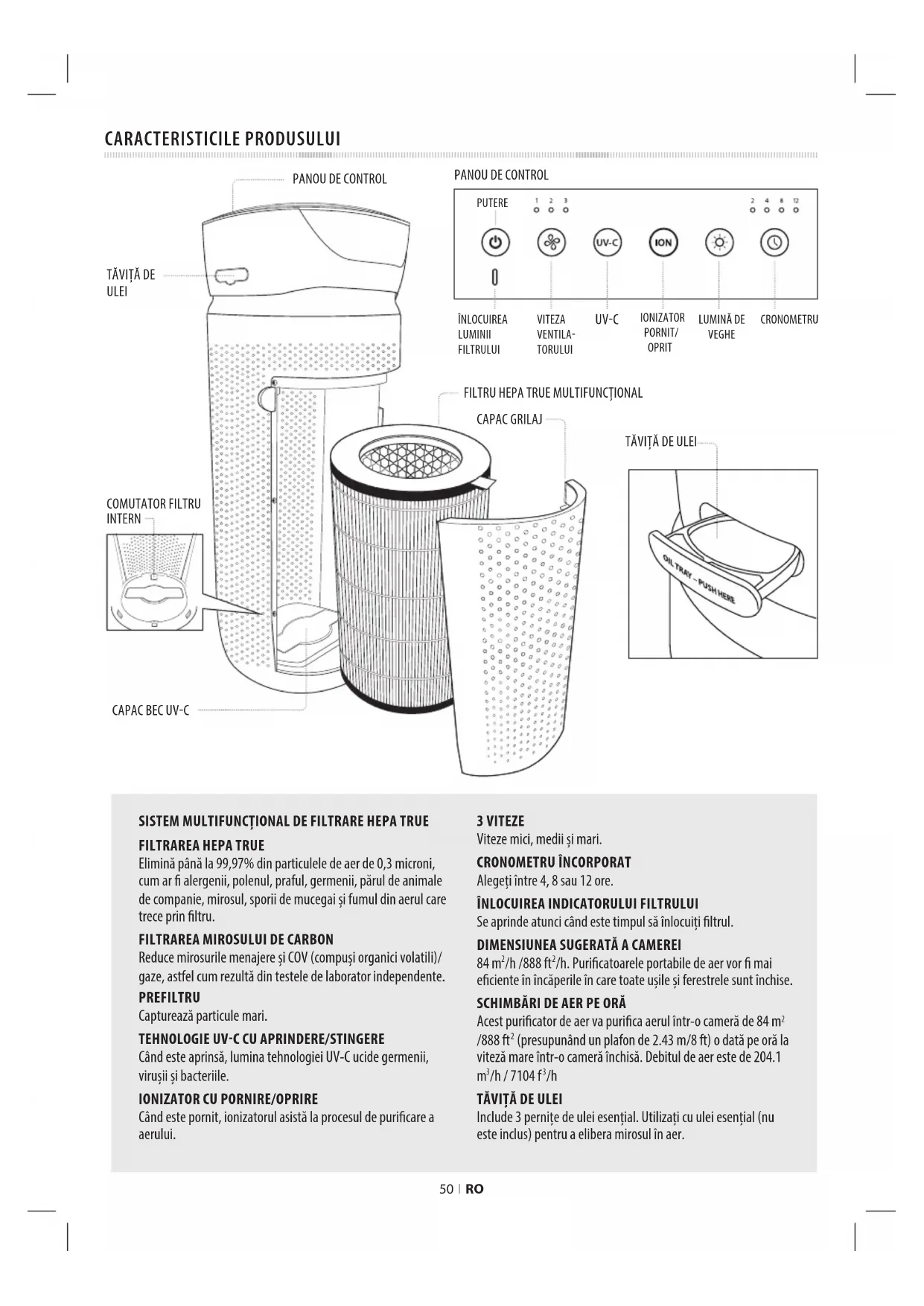 Când este pornit, ionizatorul asistă la procesul de puricare a aerului. 3 VITEZE Viteze mici, medii i mari. CRONOMETRU ÎNCORPORAT Alegei între 4, 8 sau 12 ore.