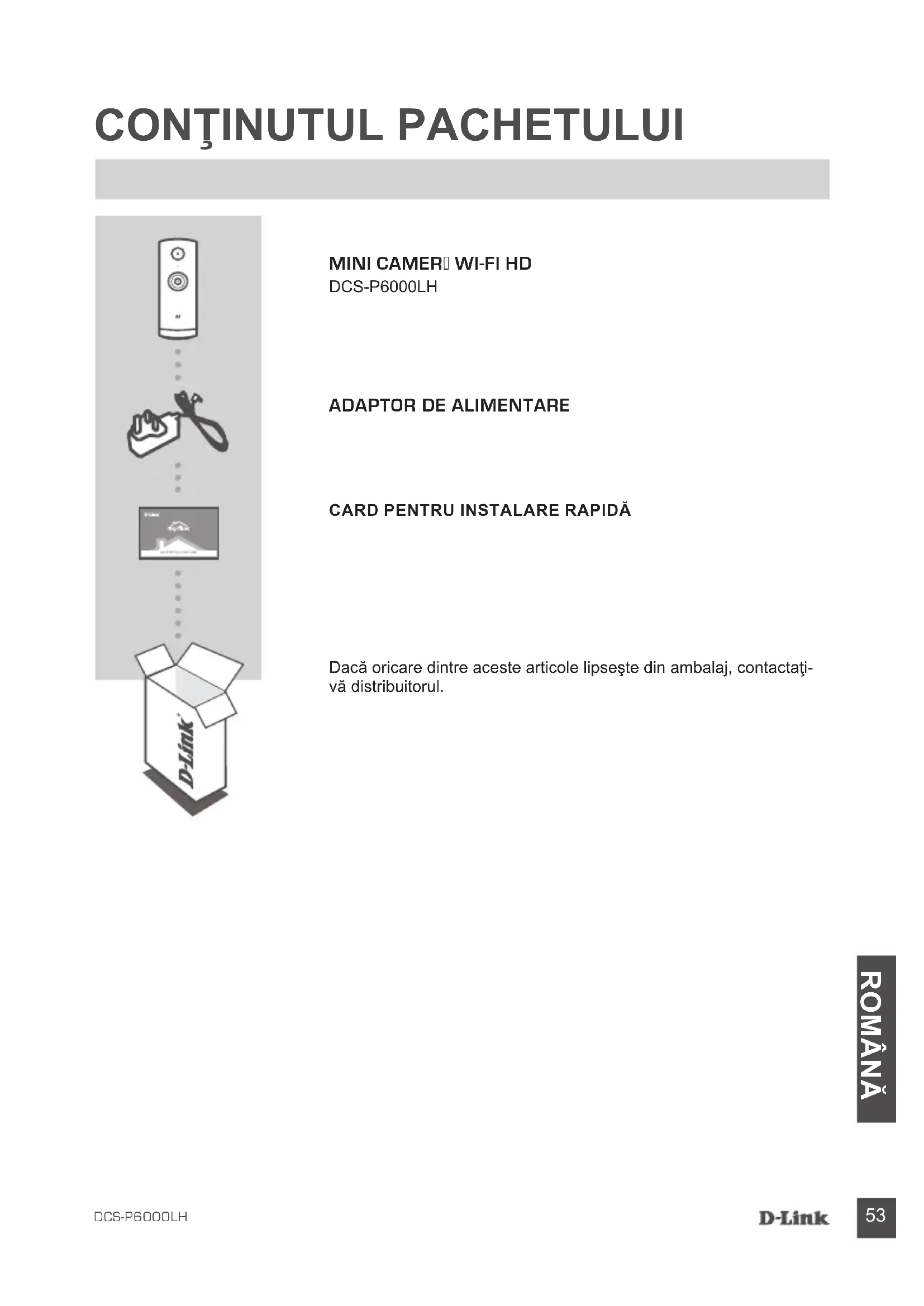 - iPhone, iPad, smartphone sau tabletă Android (consultaţi pagina magazinului de aplicaţii pentru dispozitive mobile pentru a aa dacă dispozitivul dvs. este compatibil)Urmaţi instrucţiunile de mai jos pentru a congura camera mydlink.Felicitări, camera dvs. DCS-P6000LH este gata de utilizare! Vă recomandăm să consultaţi cu regularitate site-ul web mydlink.com pentru a descărca cele mai recente actualizări rmware. Astfel, vă puteţi asigura că produsul dvs. funcţionează în siguranţă şi că beneciaţi de cele mai noi caracteristici ale acestuia. Notă: Dacă întâmpinaţi probleme la înregistrarea camerei cu contul mydlink sau dacă aţi achiziţionat o unitate a cărei cutii a fost deschisă sau o unitate la mâna a doua, efectuaţi o resetare la valorile din fabrică apăsând şi menţinând apăsat butonul de resetare al dispozitivului timp de 10 secunde (dispozitivul trebuie să e pornit). Dacă returnaţi dispozitivul la locul de la care l-aţi achiziţionat, efectuaţi procedura de resetare la valorile din fabrică pentru a elimina toate datele personale din dispozitiv. Pasul 1: Pe dispozitivul dvs. mobil, descărcaţi aplicaţia mydlink căutând textul mydlink în iTunes App Store, Google Play. Pasul 2: Lansaţi aplicaţia mydlink şi creaţi un cont nou sau conectaţi-vă la contul existent. Atunci când vi se solicită să scanaţi un cod QR, utilizaţi codul de pe cardul de instalare rapidă (aat în ambalajul produsului) sau de pe eticheta ataşată la dispozitivul dvs. CONFIGURAREA PRODUSULUI