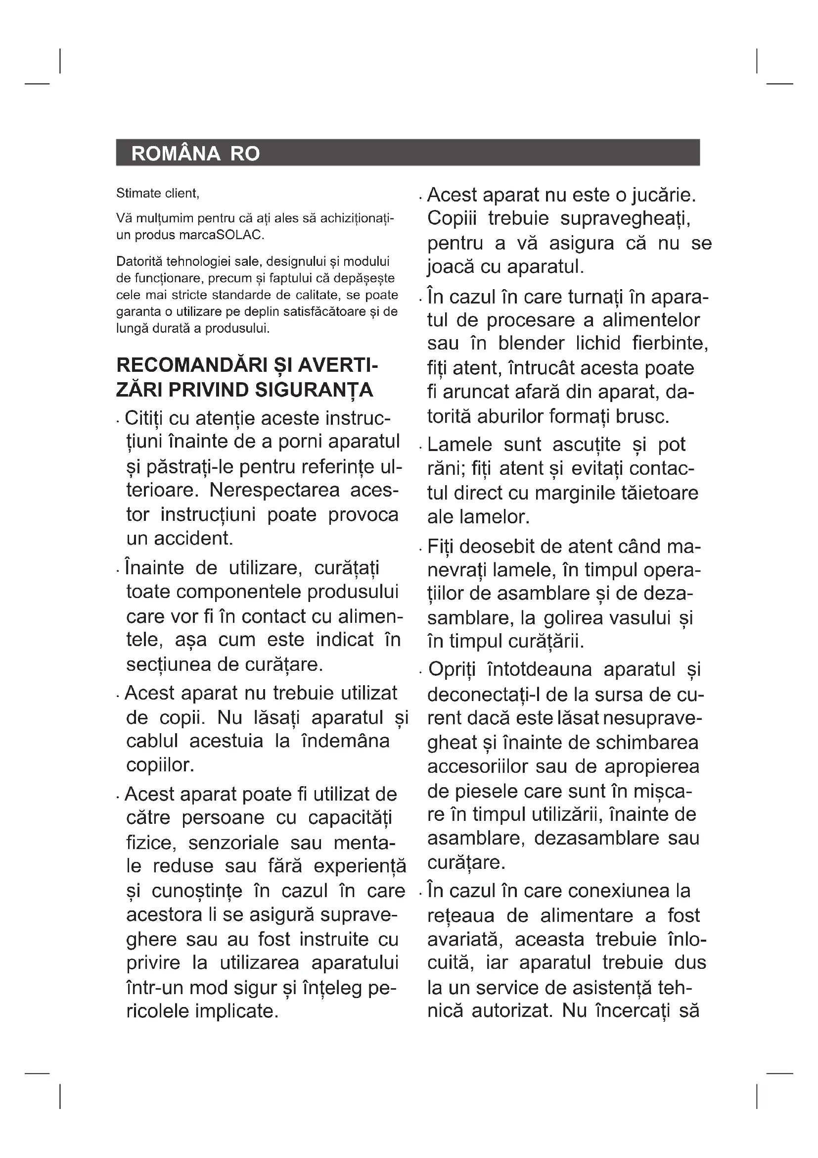 Stimate client, Vă mulțumim pentru că ați ales să achiziționați- un produs marcaSOLAC. Datorită tehnologiei sale, designului și modului de funcționare, precum și faptului că depășește cele mai stricte standarde de calitate, se poate garanta o utilizare pe deplin satisfăcătoare și de lungă durată a produsului.