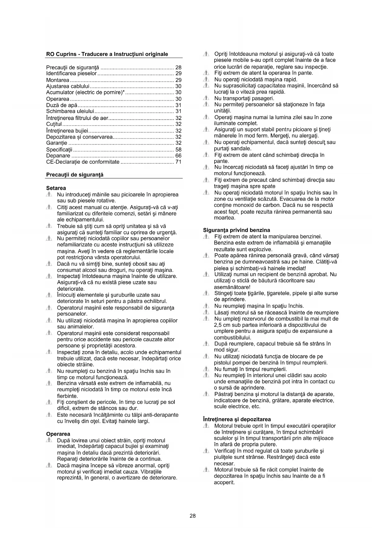 - CE-Declarație de conformitate Precauţii de siguranţă Setarea Nu introduceţi mâinile sau picioarele în apropierea sau sub piesele rotative. Citiţi acest manual cu atenţie. Asiguraţi-vă că v-aţi familiarizat cu diferitele comenzi, setări şi mânere ale echipamentului. Trebuie să ştiţi cum să opriţi unitatea şi să vă asiguraţi că sunteţi familiar cu oprirea de urgenţă. Nu permiteţi niciodată copiilor sau persoanelor nefamiliarizate cu aceste instrucţiuni să utilizeze maşina. Aveţi în vedere că reglementările locale pot restricţiona vârsta operatorului. Dacă nu vă simţiţi bine, sunteţi obosit sau aţi consumat alcool sau droguri, nu operaţi maşina. Inspectaţi întotdeauna maşina înainte de utilizare. Asiguraţi-vă că nu există piese uzate sau deteriorate. Înlocuiţi elementele şi şuruburile uzate sau deteriorate în seturi pentru a păstra echilibrul. Operatorul maşinii este responsabil de siguranţa persoanelor. Nu utilizaţi niciodată maşina în apropierea copiilor sau animalelor. Operatorul maşinii este considerat responsabil pentru orice accidente sau pericole cauzate altor persoane şi proprietăţii acestora. Inspectaţi zona în detaliu, acolo unde echipamentul trebuie utilizat, dacă este necesar, îndepărtaţi orice obiecte străine. Nu reumpleţi cu benzină în spaţiu închis sau în timp ce motorul funcţionează. Benzina vărsată este extrem de inflamabilă, nu reumpleţi niciodată în timp ce motorul este încă fierbinte. Fiţi conştient de pericole, în timp ce lucraţi pe sol dificil, extrem de stâncos sau dur. Este necesară încălţăminte cu tălpi anti-derapante cu înveliş din oţel. Evitaţi hainele largi. Operarea După lovirea unui obiect străin, opriţi motorul imediat, îndepărtaţi capacul bujiei şi examinaţi maşina în detaliu dacă prezintă deteriorări. Reparaţi deteriorările înainte de a continua. Dacă maşina începe să vibreze anormal, opriţi motorul şi verificaţi imediat cauza. Vibraţiile reprezintă, în general, o avertizare de deteriorare. Opriţi întotdeauna motorul şi asiguraţi-vă că toate piesele mobile s-au oprit complet înainte de a face orice lucrări de reparaţie, reglare sau inspecţie. Fiţi extrem de atent la operarea în pante. Nu operaţi niciodată maşina rapid. Nu suprasolicitaţi capacitatea maşinii, încercând să lucraţi la o viteză prea rapidă. Nu transportaţi pasageri. Nu permiteţi persoanelor să staţioneze în faţa unităţii. Operaţi maşina numai la lumina zilei sau în zone iluminate complet. Asiguraţi un suport stabil pentru picioare şi ţineţi mânerele în mod ferm. Mergeţi, nu alergaţi. Nu operaţi echipamentul, dacă sunteţi desculţ sau purtaţi sandale. Fiţi extrem de atent când schimbaţi direcţia în pante. Nu încercaţi niciodată să faceţi ajustări în timp ce motorul funcţionează. Fiţi extrem de precaut când schimbaţi direcţia sau trageţi maşina spre spate Nu operaţi niciodată motorul în spaţiu închis sau în zone cu ventilaţie scăzută. Evacuarea de la motor conţine monoxid de carbon. Dacă nu se respectă acest fapt, poate rezulta rănirea permanentă sau moartea. Siguranţa privind benzina Fiţi extrem de atent la manipularea benzinei. Benzina este extrem de inflamabilă şi emanaţiile rezultate sunt explozive. Poate apărea rănirea personală gravă, când vărsaţi benzina pe dumneavoastră sau pe haine. Clătiţi-vă pielea şi schimbaţi-vă hainele imediat! Utilizaţi numai un recipient de benzină aprobat. Nu utilizaţi o sticlă de băutură răcoritoare sau asemănătoare! Stingeţi toate ţigările, ţigaretele, pipele şi alte surse de aprindere. Nu reumpleţi maşina în spaţiu închis. Lăsaţi motorul să se răcească înainte de reumplere Nu umpleţi rezervorul de combustibil la mai mult de 2,5 cm sub partea inferioară a dispozitivului de umplere pentru a asigura spaţiu de expansiune a combustibilului. După reumplere, capacul trebuie să fie strâns în mod sigur. Nu utilizaţi niciodată funcţia de blocare de pe pistolul pompei de benzină în timpul reumplerii. Nu fumaţi în timpul reumplerii. Nu reumpleţi în interiorul unei clădiri sau acolo unde emanaţiile de benzină pot intra în contact cu o sursă de aprindere. Păstraţi benzina şi motorul la distanţă de aparate, indicatoare de benzină, grătare, aparate electrice, scule electrice, etc. Întreţinerea şi depozitarea Motorul trebuie oprit în timpul executării operaţiilor de întreţinere şi curăţare, în timpul schimbării sculelor şi în timpul transportării prin alte mijloace în afară de propria putere. Verificaţi în mod regulat că toate şuruburile şi piuliţele sunt strânse. Restrângeţi dacă este necesar. Motorul trebuie să fie răcit complet înainte de depozitarea în spaţiu închis sau înainte de a fi acoperit.29 Dacă maşina este neutilizată o anumită perioadă de timp, vă rugăm să consultaţi instrucţiunile din acest manual. Întreţineţi sau înlocuiţi etichetele de siguranţă şi cu instrucţiuni, dacă este necesar. Utilizaţi numai piese de schimb şi accesorii originale. Dacă nu se utilizează piese sau accesorii originale, răspunderea nu se mai aplică. Diverse Motorul nu este pre-umplut cu ulei. Dispozitivele de control montate din fabrică, precum cablul de ambreiaj montat pe mâner, nu trebuie îndepărtat sau expus. Goliţi rezervorul de combustibil numai în aer liber. Benzina este extrem de inflamabilă şi emanaţiile rezultate sunt explozive. Asiguraţi-vă că maşina este asigurată corect când este transportată pe o platformă etc. Produsele electrice uzate nu trebuie aruncate la gunoiul menajer. Acest dispozitiv trebuie predat la un centru de reciclare pentru procesarea sigură. Maşina de tuns iarba a fost fabricată conform celor mai recente cerinţe de siguranţă. Acestea includ o frână a cuţitului care opreşte motorul şi cuţit