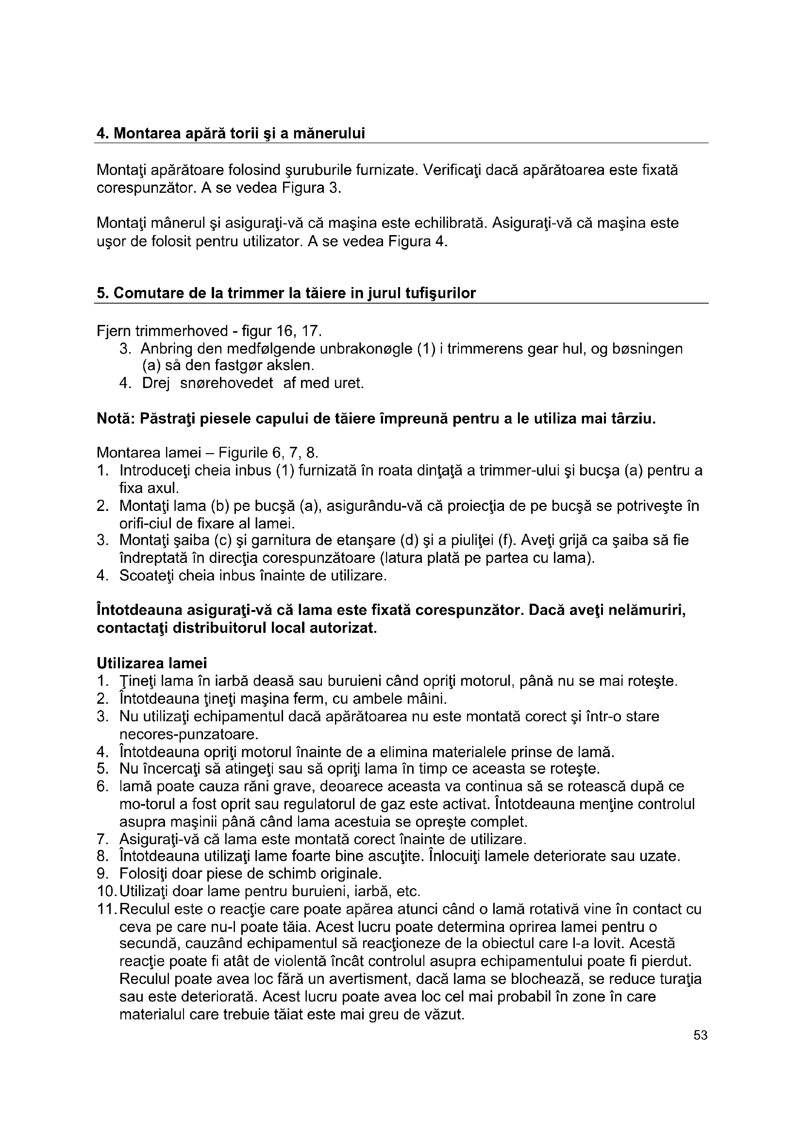 at. Întotdeauna verificaţi dacă capul de tăiere este montat corect şi bine strâns. Imposibilitatea de a face acest lucru poate cauza vătămări corporale grave. Verificaţi dacă apărătorile şi mânerul este montat şi fixat corect. Capul de tăiere se va roti în momentul accelerării motorului. Purtaţi ochelarii de protecţie şi respectaţi toate instrucţiunile de siguranţă. Lăsaţi motorul să se răcească înainte de depozitare. Goliţi rezervorul de combustibil şi asiguraţi trimmer-ul pentru a preveni deplasarea acestuia în timpul transportului.52