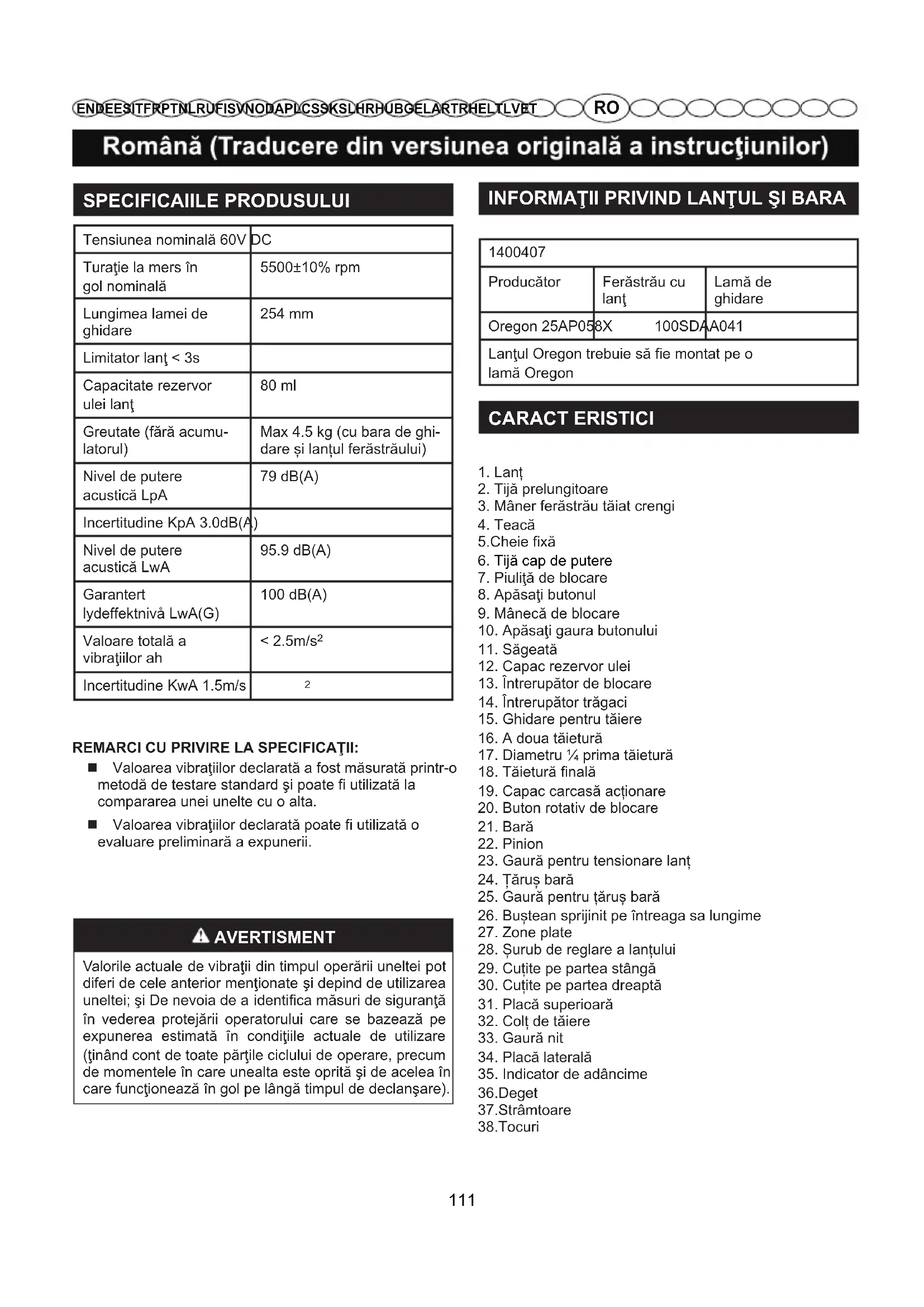 REMARCI CU PRIVIRE LA SPECIFICAŢII: Valoarea vibraţiilor declarată a fost măsurată printr-o metodă de testare standard şi poate fi utilizată la compararea unei unelte cu o alta. Valoarea vibraţiilor declarată poate fi utilizată o evaluare preliminară a expunerii. AVERTISMENT Valorile actuale de vibraţii din timpul operării uneltei pot diferi de cele anterior menţionate şi depind de utilizarea uneltei; şi De nevoia de a identica măsuri de siguranţă în vederea protejării operatorului care se bazează pe expunerea estimată în condiţiile actuale de utilizare (ţinând cont de toate părţile ciclului de operare, precum de momentele în care unealta este oprită şi de acelea în care funcţionează în gol pe lângă timpul de declanşare). INFORMAŢII PRIVIND LANŢUL ŞI BARA