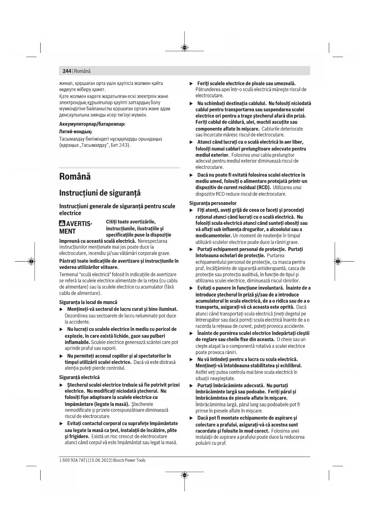 Ұсынылған литий-иондық аккумуляторлар қауіпті тауарларға қойылатын талаптарға бағынады. Пайдаланушы аккумуляторларды көшеде қосымша құжаттарсыз тасымалдай алады. Үшінші тұлғалар (мысалы, әуе көлігі немесе жіберу) орамаға және маркаларға қойылатын арнайы талаптарды сақтау керек. Жіберуге дайындау кезінде қауіпті жүктерді тасымалдау маманымен хабарласу керек. Аккумуляторды корпусы зақымдалған болса ғана жіберіңіз. Ашық түйіспелерді желімдеңіз және аккумуляторды орамада қозғалмайтындай ораңыз. Қажет болса, қосымша ұлттық ережелерді сақтаңыз. Кәдеге жарату Электр құралдарды, аккумуляторларды, керек-жарақтарды және орау материалдарын экологиялық тұрғыдан дұрыс утилизациялауға тапсыру керек. Электр құралдарды және аккумуляторларды/батареяларды үй қоқысына тастамаңыз! Тек қана ЕО елдері үшін: Ескі электрлік және электрондық құрылғылар туралы 2012/19/EU еуропалық директивасы және оның ұлттық заңнамада қолданылуы бойынша пайдалануға бұдан былай жарамсыз электрлік құралдарды және 2006/66/ ЕC еуропалық директивасы бойынша зақымдалған немесе ескірген аккумуляторларды/батареяларды бөлек Bosch Power Tools 1 609 92A 7AT | (15.06.2022)244 | Română жинап, қоршаған орта үшін қауіпсіз жолмен қайта өңдеуге жіберу қажет. Қате жолмен кәдеге жаратылған ескі электрлік және электрондық құрылғылар қауіпті заттардың болу мүмкіндігіне байланысты қоршаған ортаға және адам денсаулығына зиянды әсер тигізуі мүмкін. Аккумуляторлар/батареялар: Литий-иондық: Тасымалдау бөліміндегі нұсқауларды орындаңыз (қараңыз „Тасымалдау“, Бет243). Română Instrucţiuni de siguranţă Instrucţiuni generale de siguranţă pentru scule electrice AVERTIS- MENT Citiţi toate avertizările, instrucţiunile, ilustraţiile şi specificaţiile puse la dispoziţie împreună cu această sculă electrică. Nerespectarea instrucţiunilor menţionate mai jos poate duce la electrocutare, incendiu şi/sau vătămări corporale grave. Păstraţi toate indicaţiile de avertizare şi instrucţiunile în vederea utilizărilor viitoare. Termenul "sculă electrică" folosit în indicaţiile de avertizare se referă la sculele electrice alimentate de la reţea (cu cablu de alimentare) sau la sculele electrice cu acumulator (fără cablu de alimentare). Siguranţa la locul de muncă u Menţineţi‑vă sectorul de lucru curat şi bine iluminat. Dezordinea sau sectoarele de lucru neluminate pot duce la accidente. u Nu lucraţi cu sculele electrice în mediu cu pericol de explozie, în care există lichide, gaze sau pulberi inflamabile. Sculele electrice generează scântei care pot aprinde praful sau vaporii. u Nu permiteţi accesul copiilor şi al spectatorilor în timpul utilizării sculei electrice. Dacă vă este distrasă atenţia puteţi pierde controlul. Siguranţă electrică u Ştecherul sculei electrice trebuie să fie potrivit prizei electrice. Nu modificaţi niciodată ştecherul. Nu folosiţi fişe adaptoare la sculele electrice cu împământare (legate la masă). Ştecherele nemodificate şi prizele corespunzătoare diminuează riscul de electrocutare. u Evitaţi contactul corporal cu suprafeţe împământate sau legate la masă ca ţevi, instalaţii de încălzire, plite şi frigidere. Există un risc crescut de electrocutare atunci când corpul vă este împământat sau legat la masă. u Feriţi sculele electrice de ploaie sau umezeală. Pătrunderea apei într‑o sculă electrică măreşte riscul de electrocutare. u Nu schimbaţi destinaţia cablului. Nu folosiţi niciodată cablul pentru transportarea sau suspendarea sculei electrice ori pentru a trage ştecherul afară din priză. Feriţi cablul de căldură, ulei, muchii ascuţite sau componente aflate în mişcare. Cablurile deteriorate sau încurcate măresc riscul de electrocutare. u Atunci când lucraţi cu o sculă electrică în aer liber, folosiţi numai cabluri prelungitoare adecvate pentru mediul exterior. Folosirea unui cablu prelungitor adecvat pentru mediul exterior diminuează riscul de electrocutare. u Dacă nu poate fi evitată folosirea sculei electrice în mediu umed, folosiţi o alimentare protejată printr-un dispozitiv de curent rezidual (RCD). Utilizarea unui dispozitiv RCD reduce riscul de electrocutare. Siguranţa persoanelor u Fiţi atenţi, aveţi grijă de ceea ce faceţi şi procedaţi raţional atunci când lucraţi cu o sculă electrică. Nu folosiţi scula electrică atunci când sunteţi obosiţi sau vă aflaţi sub influenţa drogurilor, a alcoolului sau a medicamentelor. Un moment de neatenţie în timpul utilizării sculelor electrice poate duce la răniri grave. u Purtaţi echipament personal de protecţie. Purtaţi întoteauna ochelari de protecţie. Purtarea echipamentului personal de protecţie, ca masca pentru p