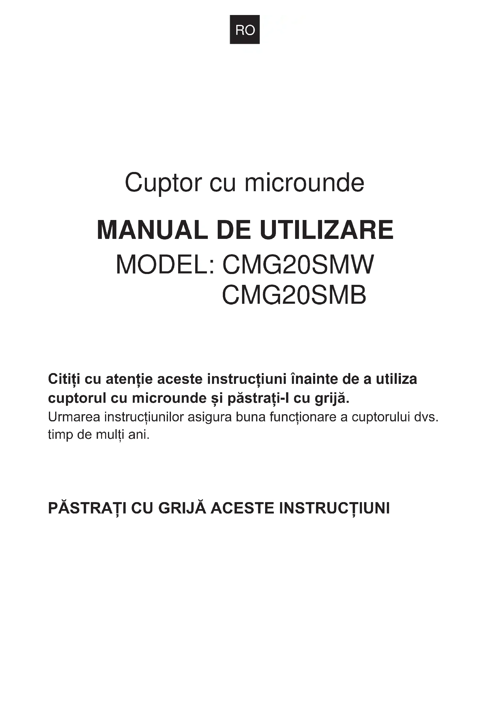 CMG20SMB Citiți cu atenție aceste instrucțiuni înainte de a utiliza cuptorul cu microunde și păstrați-l cu grijă. Urmarea instrucțiunilor asigura buna funcționare a cuptorului dvs. timp de mulți ani. PĂSTRAȚI CU GRIJĂ ACESTE INSTRUCȚIUNIRO
