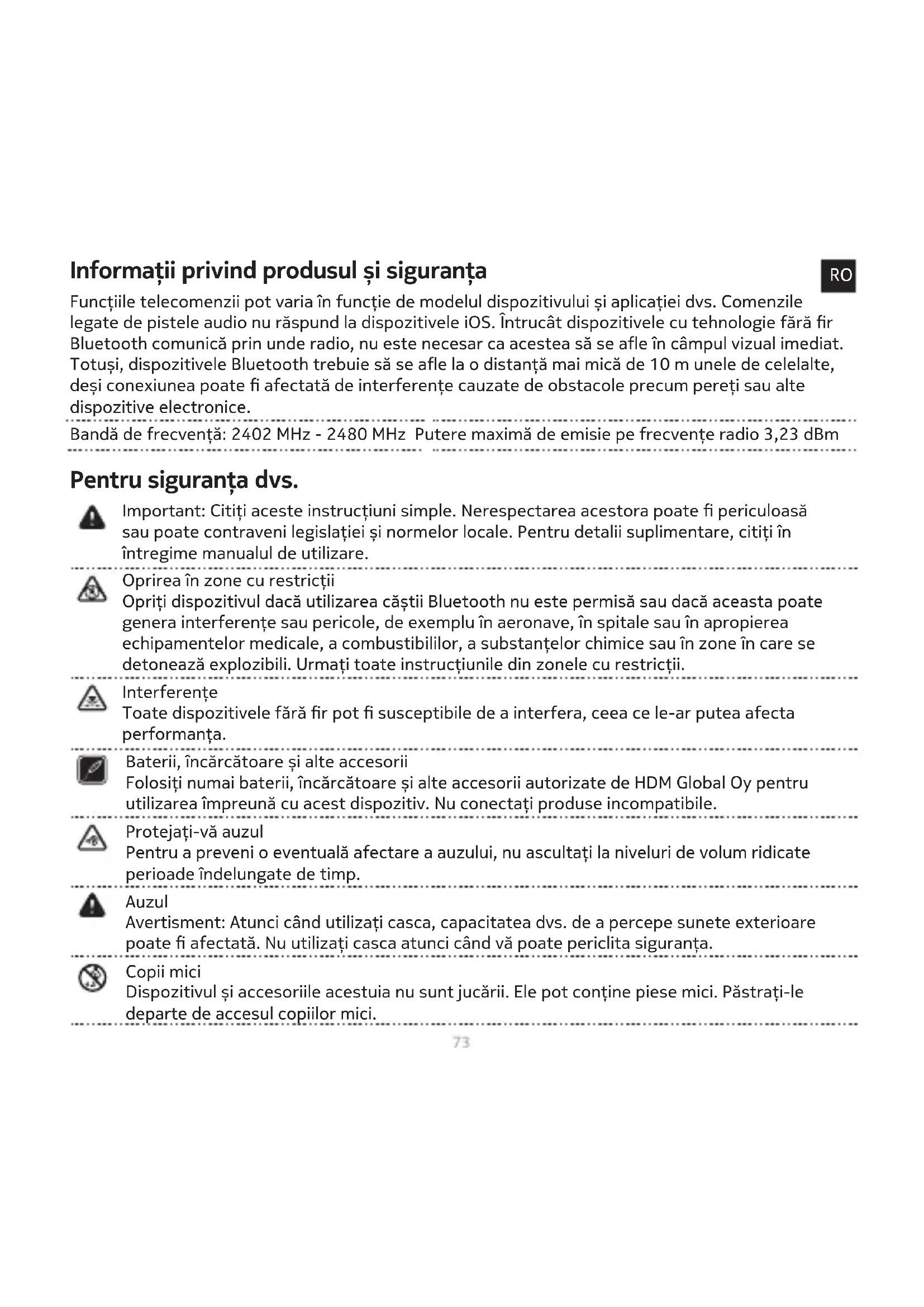 de latență redusă > OPRIT. Important: Citiți aceste instrucțiuni simple. Nerespectarea acestora poate periculoasă sau poate contraveni legislației și normelor locale. Pentru detalii suplimentare, citiți în întregime manualul de utilizare. Oprirea în zone cu restricții Opriți dispozitivul dacă utilizarea căștii Bluetooth nu este permisă sau dacă aceasta poate genera interferențe sau pericole, de exemplu în aeronave, în spitale sau în apropierea echipamentelor medicale, a combustibililor, a substanțelor chimice sau în zone în care se detonează explozibili. Urmați toate instrucțiunile din zonele cu restricții. Interferențe Toate dispozitivele fără r pot susceptibile de a interfera, ceea ce le-ar putea afecta performanța. Pentru siguranța dvs. Baterii, încărcătoare și alte accesorii Folosiți numai baterii, încărcătoare și alte accesorii autorizate de HDM Global Oy pentru utilizarea împreună cu acest dispozitiv. Nu conectați produse incompatibile. Protejați-vă auzul Pentru a preveni o eventuală afectare a auzului, nu ascultați la niveluri de volum ridicate perioade îndelungate de timp. Auzul Avertisment: Atunci când utilizați casca, capacitatea dvs. de a percepe sunete exterioare poate afectată. Nu utilizați casca atunci când vă poate periclita siguranța. Copii mici Dispozitivul și accesoriile acestuia nu sunt jucării. Ele pot conține piese mici. Păstrați-le departe de accesul copiilor mici.