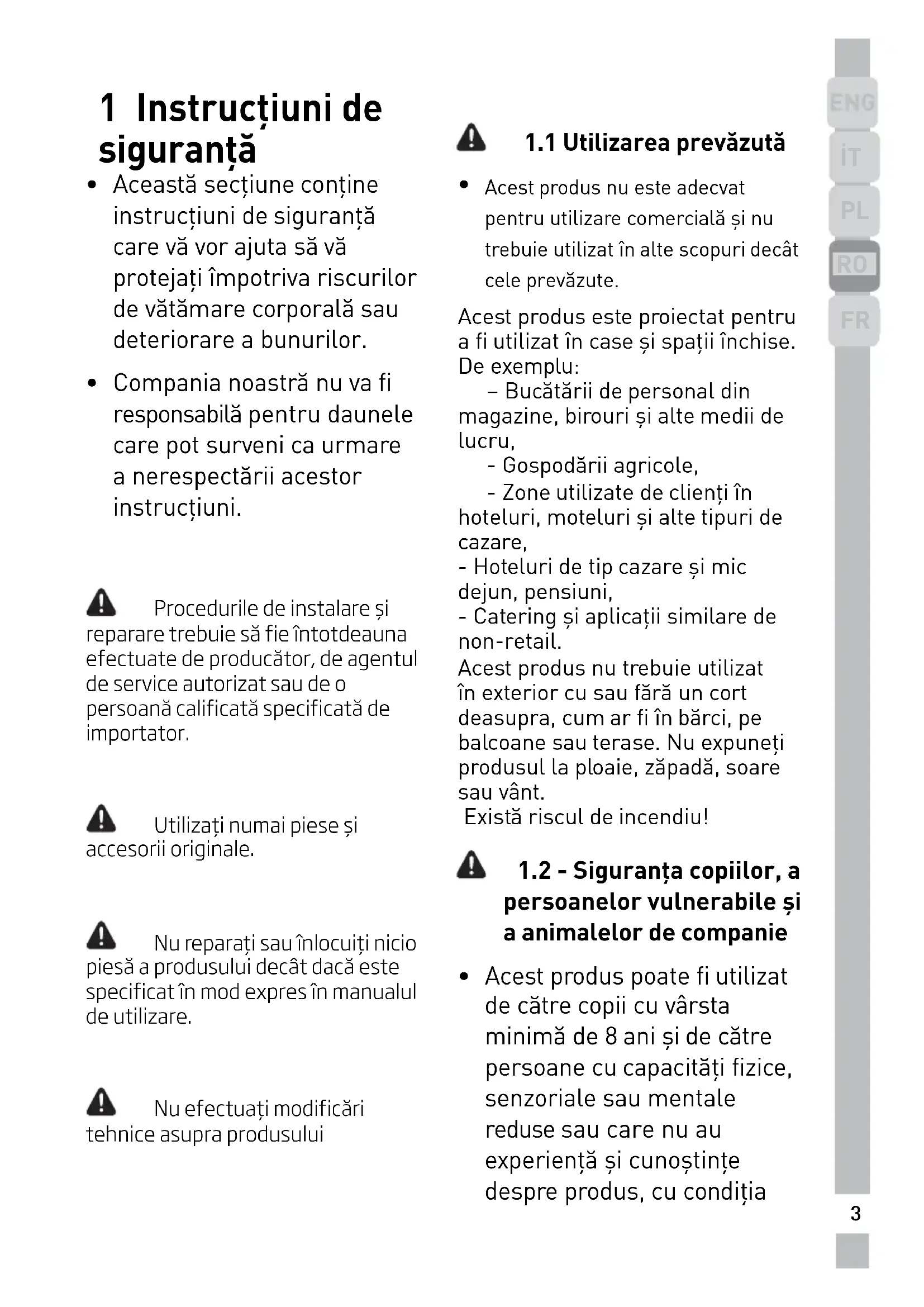 Acestproduspoatefiutilizat decătrecopiicuvârsta minimăde8anișidecătre persoanecucapacitățifizice, senzorialesaumentale redusesaucarenuau experiențășicunoștințe despreprodus,cucondiția4 săfiesupravegheațisau instruițicuprivirelautilizarea însiguranțăaprodusuluiși lariscurilepecareleimplică acesta. Copiilorcuvârstacuprinsă între3și8anilisepermitesă încarceșisădescarceproduse pentrurăcire. Produseleelectricesunt periculoasepentrucopiiși animaledecompanie.Copiii șianimaleledecompanie nutrebuiesăsejoacecu produsul,nicisăseurcepe produssausăintreînacesta. Operațiuniledecurățare șideîntreținererealizate deutilizatornuvorfi făcutedecopii,cuexcepția cazuluiîncareaceștiasunt supravegheațidecineva. Nulăsațiambalajelela îndemânacopiilor.Există risculdevătămareșisufocare! Înaintedeaeliminaprodusul vechisaudepășit: