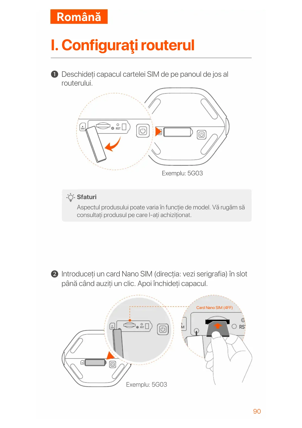 Introduceţi un card Nano SlM (direcţia: vezi serigrafia) în slot până când auziţi un clic. Apoi închideţi capacul. SIM SIM RST Exemplu: 5G03 SIM SIM RST SIM RST Card Nano SIM (4FF) Exemplu: 5G0391 Sfaturi Aspectul produsului poate varia în funcţie de model. Vă rugăm să consultaţi produsul pe care l-aţi achiziţionat. Pentru a asigura performanţa și a evita deteriorarea cartelei SIM, nu introduceţi sau scoateţi cartela SIM când routerul funcţionează. Pentru a scoate cartela SIM, apăsaţi ușor cartela SIM până când se aude un clic. Cartela SIM va ieși automat.
