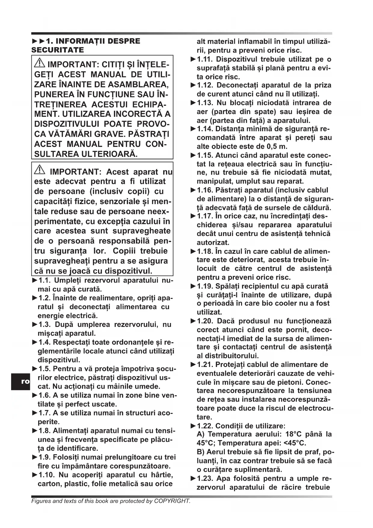 SULTAREA ULTERIOARĂ. IMPORTANT: Acest aparat nu este adecvat pentru a utilizat de persoane (inclusiv copii) cu capacități zice, senzoriale și men- tale reduse sau de persoane neex- perimentate, cu excepția cazului în care acestea sunt supravegheate de o persoană responsabilă pen- tru siguranța lor. Copiii trebuie supravegheați pentru a se asigura că nu se joacă cu dispozitivul. ►1.1. Umpleți rezervorul aparatului nu- mai cu apă curată. ►1.2. Înainte de realimentare, opriți apa- ratul și deconectați alimentarea cu energie electrică. ►1.3. După umplerea rezervorului, nu mișcați aparatul. ►1.4. Respectați toate ordonanțele și re- glementările locale atunci când utilizați dispozitivul. ►1.5. Pentru a vă proteja împotriva șocu- rilor electrice, păstrați dispozitivul us- cat. Nu acționați cu mâinile umede. ►1.6. A se utiliza numai în zone bine ven- tilate și perfect uscate. ►1.7. A se utiliza numai în structuri aco- perite. ►1.8. Alimentați aparatul numai cu tensi- unea și frecvența specicate pe plăcu- ța de identicare. ►1.9. Folosiți numai prelungitoare cu trei re cu împământare corespunzătoare. ►1.10. Nu acoperiți aparatul cu hârtie, carton, plastic, folie metalică sau orice alt material inamabil în timpul utiliză- rii, pentru a preveni orice risc. ►1.11. Dispozitivul trebuie utilizat pe o suprafață stabilă și plană pentru a evi- ta orice risc. ►1.12. Deconectați aparatul de la priza de curent atunci când nu îl utilizați. ►1.13. Nu blocați niciodată intrarea de aer (partea din spate) sau ieșirea de aer (partea din față) a aparatului. ►1.14. Distanța minimă de siguranță re- comandată între aparat și pereți sau alte obiecte este de 0,5 m. ►1.15. Atunci când aparatul este conec- tat la rețeaua electrică sau în funcțiu- ne, nu trebuie să e niciodată mutat, manipulat, umplut sau reparat. ►1.16. Păstrați aparatul (inclusiv cablul de alimentare) la o distanță de siguran- ță adecvată față de sursele de căldură. ►1.17. În orice caz, nu încredințați des- chiderea și/sau repararea aparatului decât unui centru de asistență tehnică autorizat. ►1.18. În cazul în care cablul de alimen- tare este deteriorat, acesta trebuie în- locuit de către centrul de asistență pentru a preveni orice risc. ►1.19. Spălați recipientul cu apă curată și curățați-l înainte de utilizare, după o perioadă în care bio cooler nu a fost utilizat. ►1.20. Dacă produsul nu funcționează corect atunci când este pornit, deco- nectați-l imediat de la sursa de alimen- tare și contactați centrul de asistență al distribuitorului. ►1.21. Protejați cablul de alimentare de eventualele deteriorări cauzate de vehi- cule în mișcare sau de pietoni. Conec- tarea necorespunzătoare la tensiunea de rețea sau instalarea necorespunză- toare poate duce la riscul de electrocu- tare. ►1.22. Condiții de utilizare: A) Temperatura aerului: 18°C până la 45°C; Temperatura apei: <45°C. B) Aerul trebuie să e lipsit de praf, po- luanți, în caz contrar trebuie să se facă o curățare suplimentară. ►1.23. Apa folosită pentru a umple re- zervorul aparatului de răcire trebuieFigures and texts of this book are protected by COPYRIGHT.