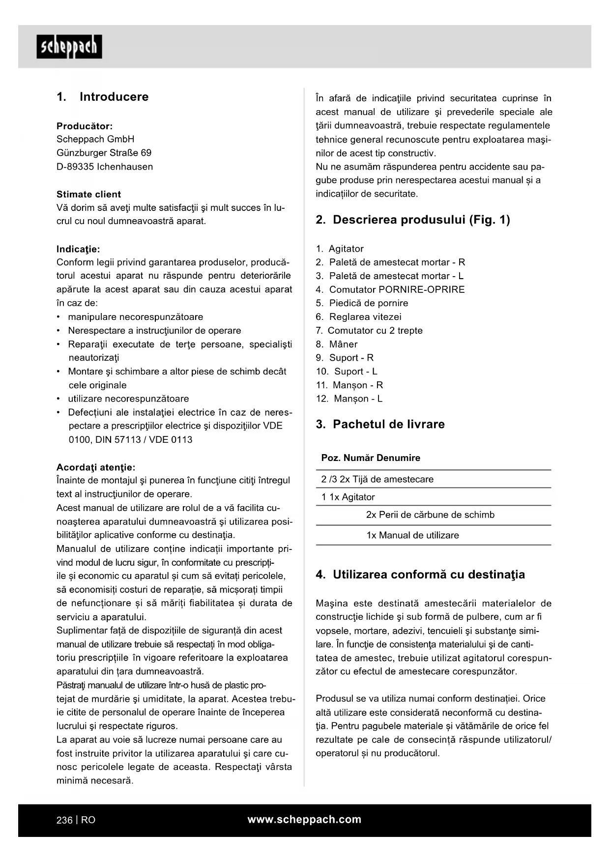 Maşina este destinată amestecării materialelor de construcţie lichide şi sub formă de pulbere, cum ar vopsele, mortare, adezivi, tencuieli şi substanţe simi- lare. În funcţie de consistenţa materialului şi de canti- tatea de amestec, trebuie utilizat agitatorul corespun- zător cu efectul de amestecare corespunzător. Produsul se va utiliza numai conform destinației. Orice altă utilizare este considerată neconformă cu destina- ţia. Pentru pagubele materiale și vătămările de orice fel rezultate pe cale de consecință răspunde utilizatorul/ operatorul și nu producătorul.