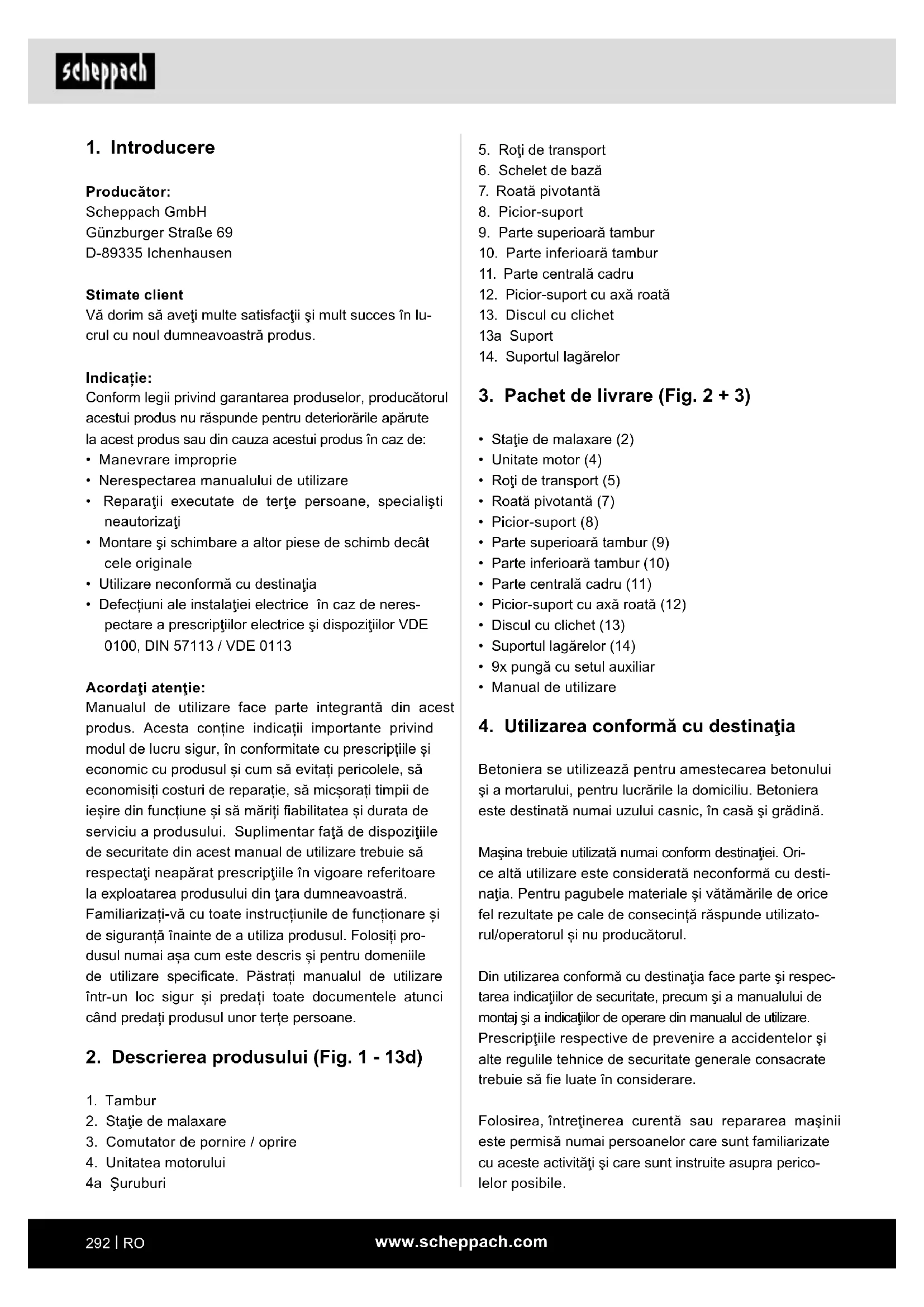 - Nu puneți niciodată mâinile pe părțile în mișcare ale mașinii atunci când aceasta este pornită. Există pe- ricolul de prindere / înfăşurare în tamburul rotativ, respectiv în uneltele de amestecare rotative. Modicările din proprie iniţiativă ale maşinii exclud orice răspundere a producătorului pentru prejudiciile rezultate din situaţiile respective. Mașina poate utilizată numai cu piese și accesorii originale ale producătorului. Prescripțiile de securitate, de lucru și de întreținere curentă emise de producător, precum și dimensiunile indicate în Date tehnice trebuie să e respectate. Vă rugăm să aveţi în vedere că aparatele noastre nu au fost construite având ca destinaţie utilizarea profe- sională sau industrială. Nu preluăm garanţia dacă apa- ratul este utilizat în regim profesional sau industrial, precum şi la activităţi la fel de solicitante. Explicitarea cuvintelor de semnalizare din manualul de utilizare m Avertizare Cuvânt de semnalizare pentru a indica o situa- ție potențial periculoasă care, dacă nu este evi- tată, ar putea avea ca rezultat decesul sau vătă- marea gravă. m PERICOL Cuvânt de semnalizare pentru a indica o situa- ție periculoasă iminentă care, dacă nu este evi- tată, va avea ca rezultat decesul sau vătămarea gravă. m PRECAUȚIE Cuvânt de semnalizare pentru a indica o situa- ție potențial periculoasă care, dacă nu este evi- tată, ar putea avea ca rezultat vătămări minore sau moderate. ATENŢIE Cuvânt de semnalizare pentru a indica o situație potențial periculoasă care, dacă nu este evitată, ar putea avea drept rezultat daune materiale la produs sau la proprietate/posesie.www.scheppach.com
