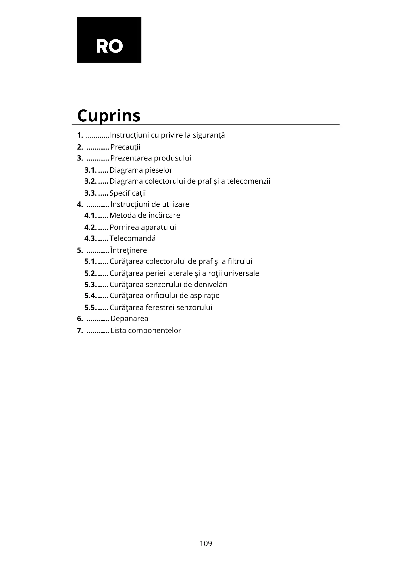 5.1. ..... Curăţarea colectorului de praf şi a ltrului 5.2. ..... Curăţarea periei laterale şi a roţii universale 5.3. ..... Curăţarea senzorului de denivelări 5.4. ..... Curăţarea oriciului de aspiraţie 5.5. ..... Curăţarea ferestrei senzorului