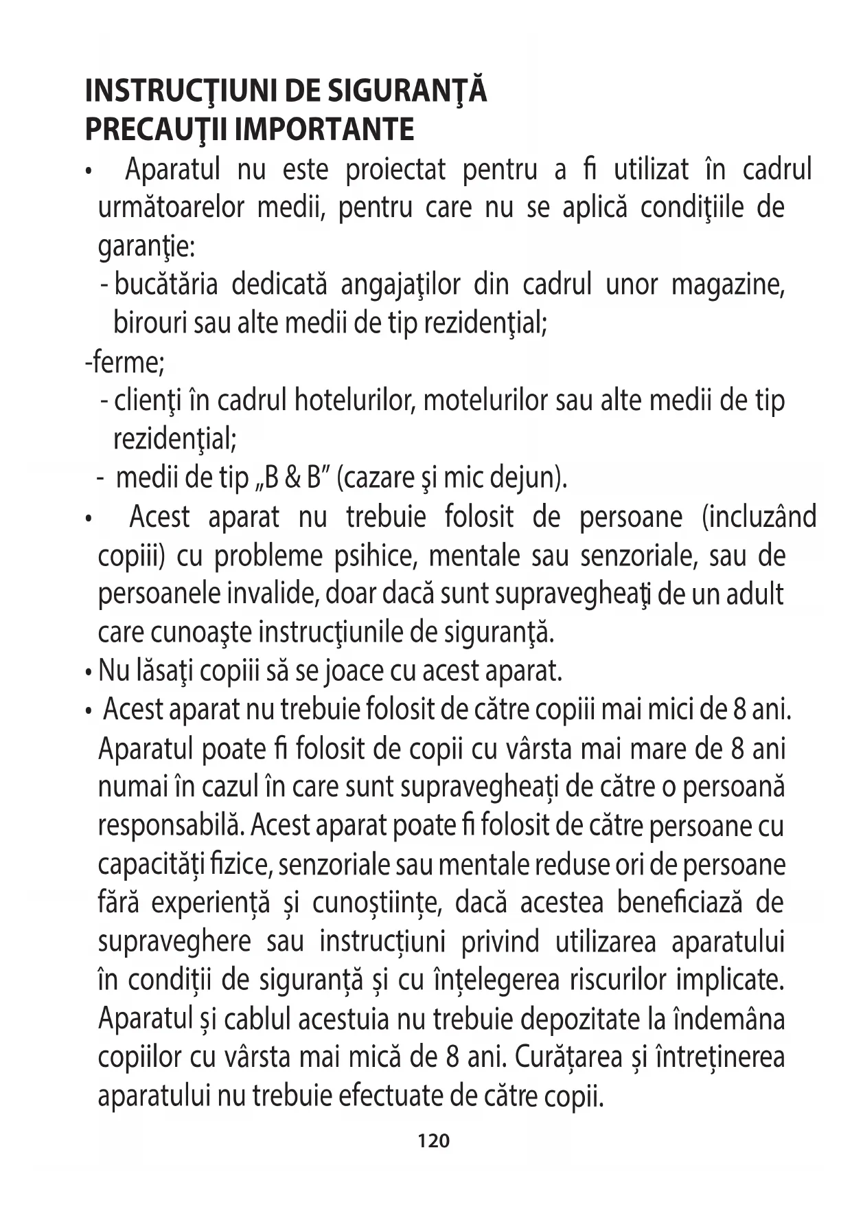 - Acest aparat nu trebuie folosit de către copiii mai mici de 8 ani. Aparatul poate folosit de copii cu vârsta mai mare de 8 ani numai în cazul în care sunt supravegheaț i de către o persoană responsabilă. Acest aparat poate folosit de cătr e persoane cu capacități zic e, senzoriale sau mentale reduse ori de persoane fără experiență și cunoștiințe, dacă acestea beneciază de supraveghere sau instrucț iuni privind utilizarea aparatului în condiții de siguranță și cu înțelegerea riscurilor implicate. Aparatul ș i cablul acestuia nu trebuie depozitate la îndemâna copiilor cu vârsta mai mică de 8 ani. Curățar ea și întreținerea aparatului nu trebuie efectuate de cătr e copii.121