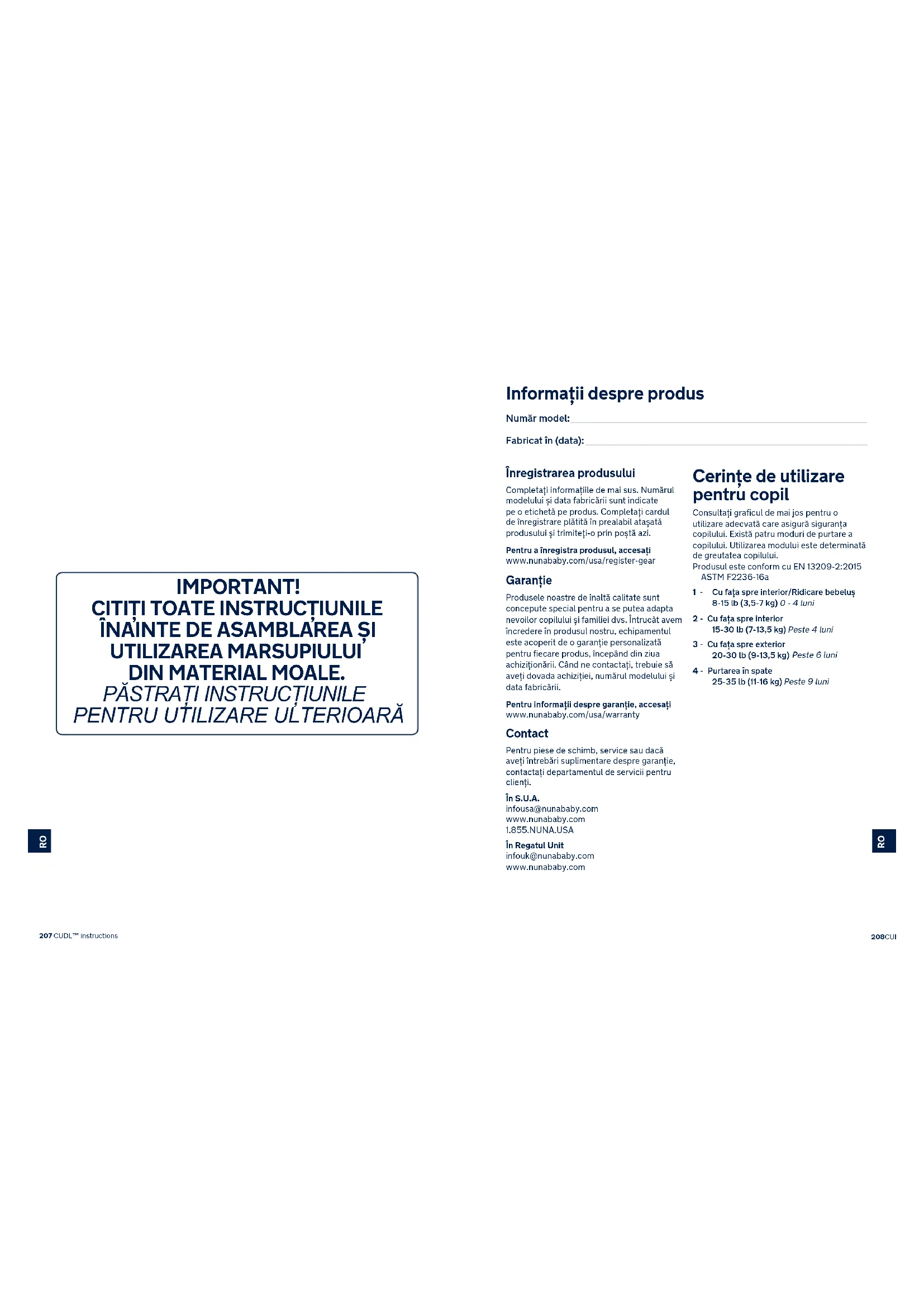 Informații despre produs Număr model: ___________________________________________________________________________________________________________________________________________________ Fabricat în (data): __________________________________________________________________________________________________________________________________________ Înregistrarea produsului Completați informațiile de mai sus. Numărul modelului și data fabricării sunt indicate pe o etichetă pe produs. Completați cardul de înregistrare plătită în prealabil atașată produsului și trimiteți-o prin poștă azi.Pentru a înregistra produsul, accesați www.nunababy.com/usa/register-gear Garanție Produsele noastre de înaltă calitate sunt concepute special pentru a se putea adapta nevoilor copilului și familiei dvs. Întrucât avem încredere în produsul nostru, echipamentul este acoperit de o garanție personalizată pentru fiecare produs, începând din ziua achiziționării. Când ne contactați, trebuie să aveți dovada achiziției, numărul modelului și data fabricării.Pentru informații despre garanție, accesați www.nunababy.com/usa/warranty Contact Pentru piese de schimb, service sau dacă aveți întrebări suplimentare despre garanție, contactați departamentul de servicii pentru clienți.În S.U.A. infousa@nunababy.com www.nunababy.com 1.855.NUNA.USAÎn Regatul Unit infouk@nunababy.com www.nunababy.com Cerințe de utilizare pentru copil Consultați graficul de mai jos pentru o utilizare adecvată care asigură siguranța copilului. Există patru moduri de purtare a copilului. Utilizarea modului este determinată de greutatea copilului. Produsul este conform cu EN 13209-2:2015 ASTM F2236-16a