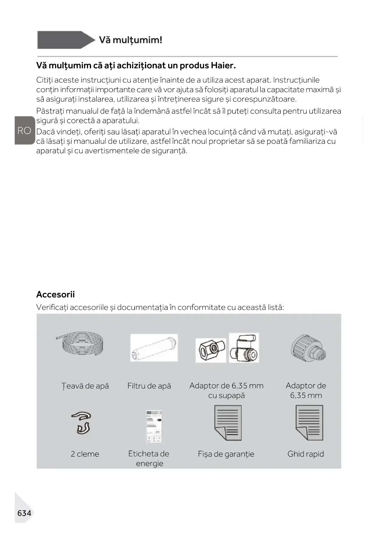 Vă mulțumim că ați achiziționat un produs Haier. Citiți aceste instrucțiuni cu atenție înainte de a utiliza acest aparat. Instrucțiunile conțin informații importante care vă vor ajuta să folosiți aparatul la capacitate maximă și să asigurați instalarea, utilizarea și întreținerea sigure și corespunzătoare. Păstrați manualul de față la îndemână astfel încât să îl puteți consulta pentru utilizarea sigură și corectă a aparatului. Dacă vindeți, oferiți sau lăsați aparatul în vechea locuință când vă mutați, asigurați-vă că lăsați și manualul de utilizare, astfel încât noul proprietar să se poată familiariza cu aparatul și cu avertismentele de siguranță. Accesorii Verificați accesoriile și documentația în conformitate cu această listă:
