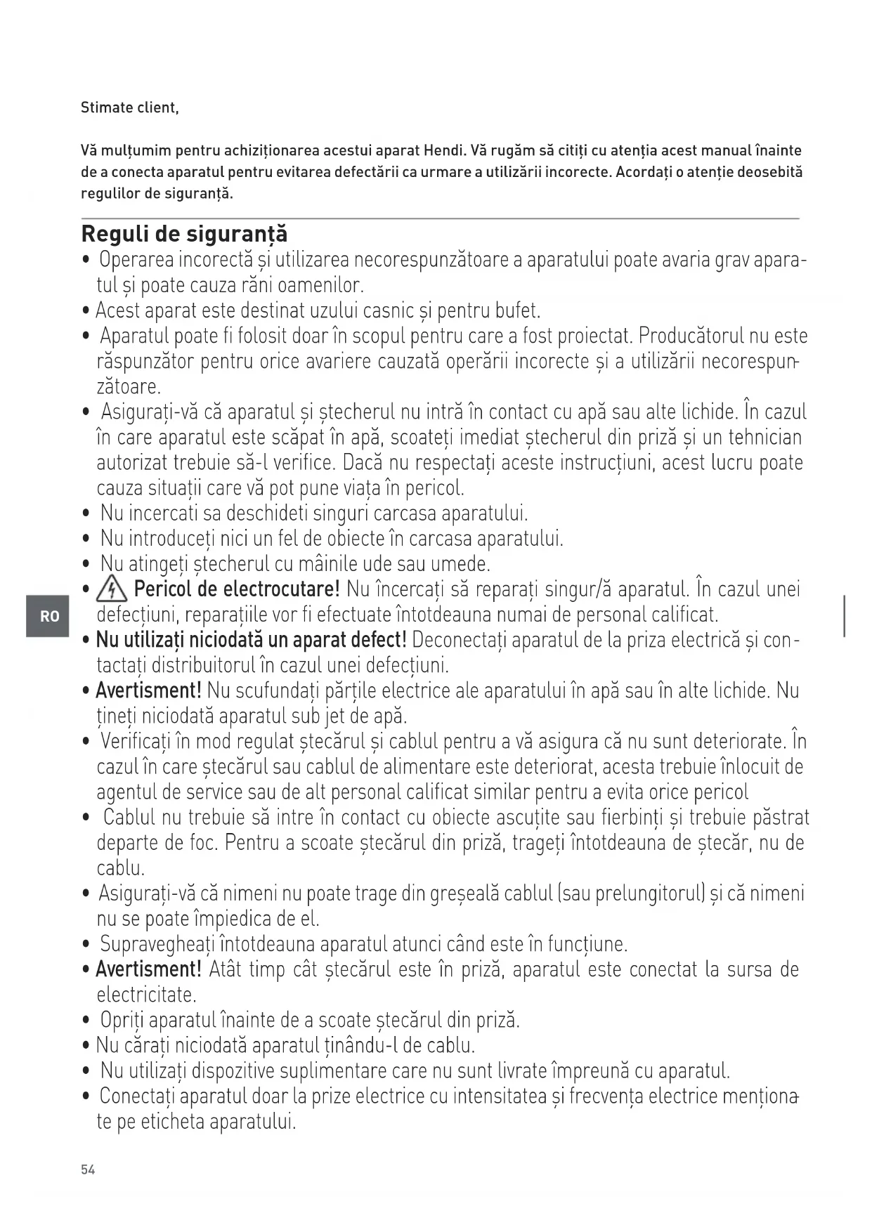 Stimate client, Vă mulțumim pentru achiziționarea acestui aparat Hendi. Vă rugăm să citiți cu atenția acest manual înainte de a conecta aparatul pentru evitarea defectării ca urmare a utilizării incorecte. Acordați o atenție deosebită regulilor de siguranță. Reguli de siguranță