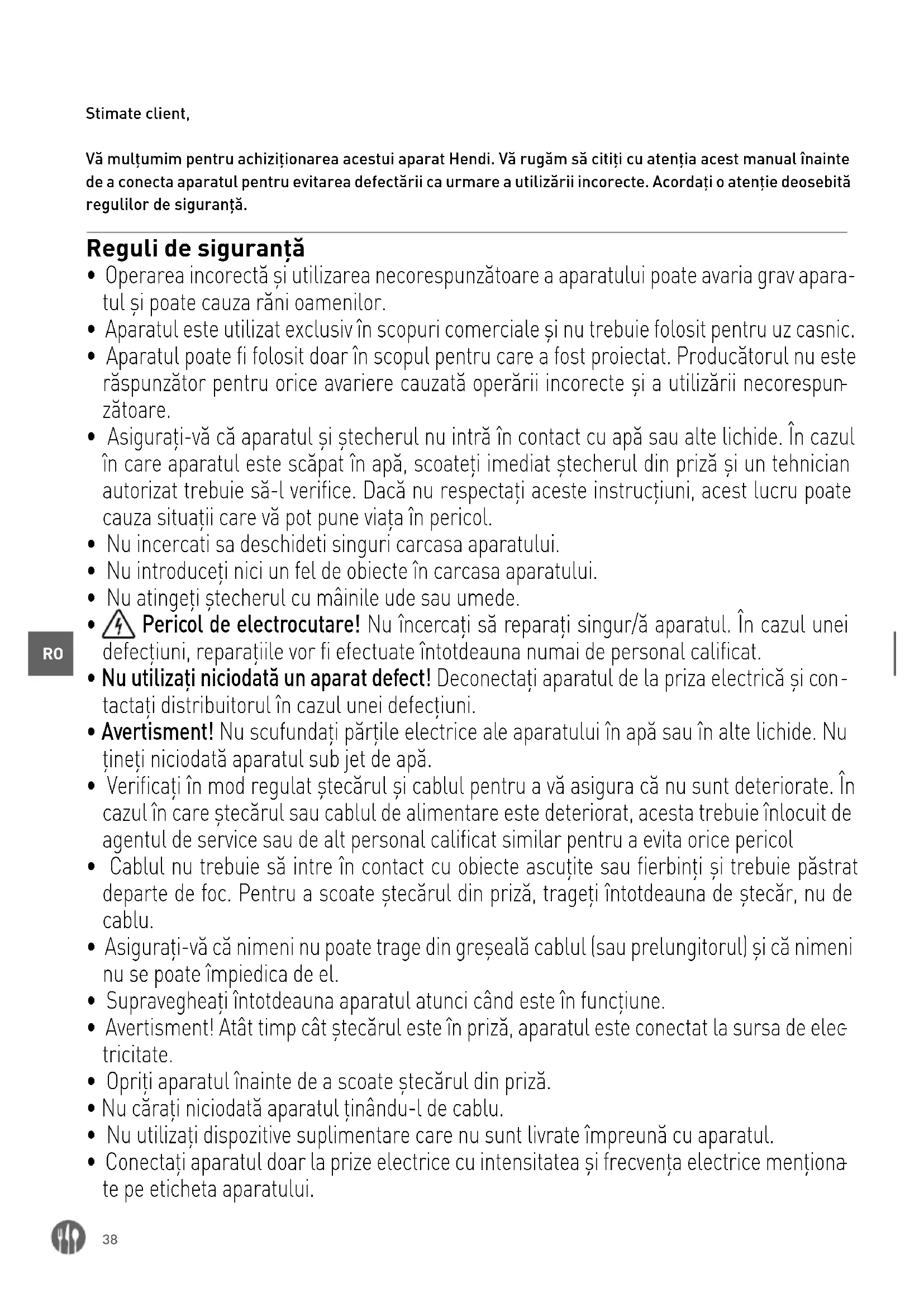 Stimate client, Vă mulțumim pentru achiziționarea acestui aparat Hendi. Vă rugăm să citiți cu atenția acest manual înainte de a conecta aparatul pentru evitarea defectării ca urmare a utilizării incorecte. Acordați o atenție deosebită regulilor de siguranță. Reguli de siguranță