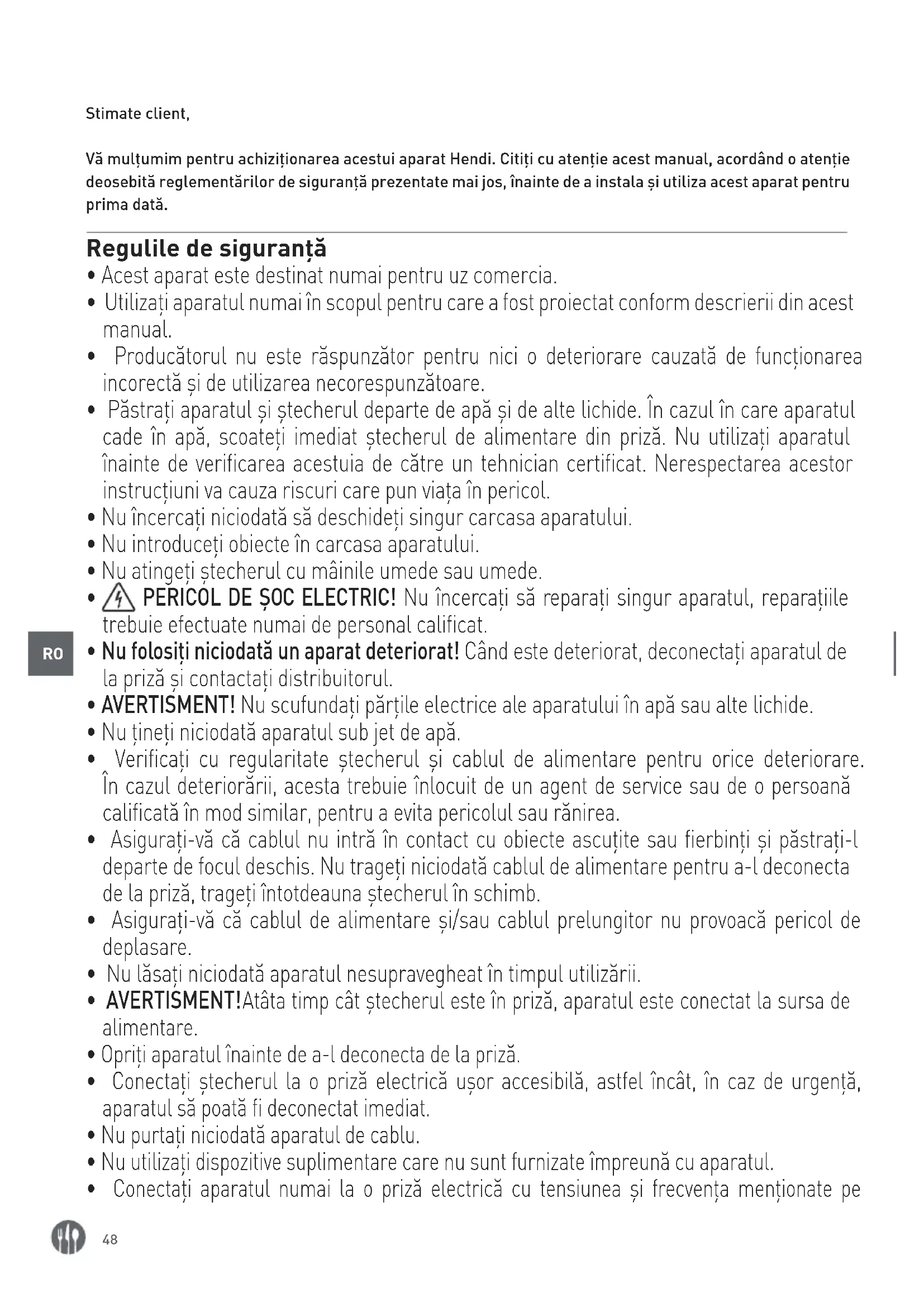Stimate client, Vă mulțumim pentru achiziționarea acestui aparat Hendi. Citiți cu atenție acest manual, acordând o atenție deosebită reglementărilor de siguranță prezentate mai jos, înainte de a instala și utiliza acest aparat pentru prima dată. Regulile de siguranță