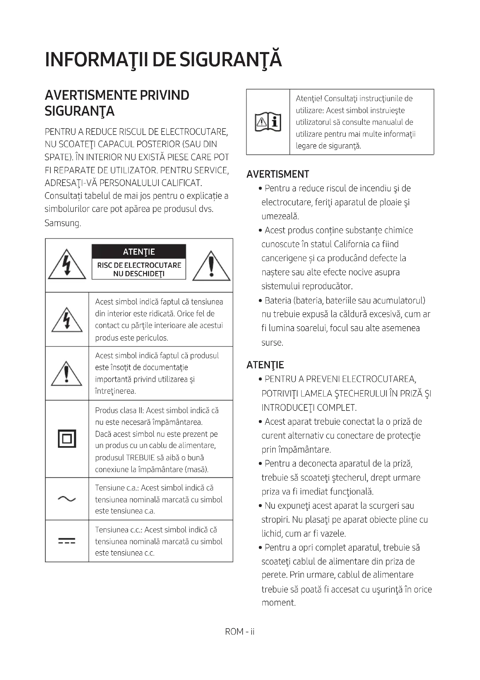 - Într-un mediu extrem de rece sau de cald, încărcarea se oprește, pentru siguranță. Pentru a rezolva aceste probleme, deconectați cablul de alimentare cu c.a. și reconectați-l când temperatura este între 5°C și 35°C.ROM - 30 Prin prezenta, Samsung declară că acest echipament radio respectă Directiva 2014/53/UE și cerințele legale relevante din Regatul Unit. Textul complet al declarației de conformitate este disponibil la următoarea adresă de internet: http://www.samsung.com. Accesați secțiunea Asistență și introduceți numele modelului. Acest echipament poate să e utilizat în toate țările din Uniunea Europeană și din Regatul Unit. [Dispoziţiiprivindeliminareacorectăabateriiloracestuiprodus] (Aplicabilînțăricusistemedecolectareseparate) Acest marcaj de pe baterie, de pe manualul de utilizare sau de pe ambalaj indică faptul că bateriile acestui produs nu trebuie eliminate împreună cu alte deşeuri menajere la sfârşitul ciclului lor de viaţă. Dacă sunt marcate, simbolurile chimice Hg, Cd sau Pb indică faptul că bateria conţine mercur, cadmiu sau plumb peste nivelurile de referinţă prevăzute în Directiva CE 2006/66. În cazul în care bateriile nu sunt eliminate corespunzător, aceste substanţe pot dăunătoare pentru sănătatea omului sau pentru mediu. În vederea protejării resurselor naturale şi a promovării refolosirii materialelor, vă rugăm să separaţi bateriile de celelalte tipuri de deşeuri şi să le reciclaţi prin intermediul sistemului gratuit de returnare a bateriilor la nivel local. Cumseeliminăcorectacestprodus (Deșeurideechipamenteelectriceșielectronice) (Aplicabilînțăricusistemedecolectareseparate) Acest simbol de pe produs, accesorii şi documentaţie indică faptul că produsul şi accesoriile sale electronice (încărcător, căşti, cablu USB) nu trebuie eliminate împreună cu alte deşeuri menajere la nalul duratei lor de utilizare. Dat ind că eliminarea necontrolată a deşeurilor poate dăuna mediului înconjurător sau sănătăţii umane, vă rugăm să separaţi aceste articole de alte tipuri de deşeuri şi să le reciclaţi în mod responsabil, promovând astfel reutilizarea durabilă a resurselor materiale. Utilizatorii casnici trebuie să-l contacteze pe distribuitorul care le-a vândut produsul sau să se intereseze la autorităţile locale unde şi cum pot să ducă aceste articole pentru a reciclate în mod ecologic. Utilizatorii comerciali trebuie să-şi contacteze furnizorul şi să consulte termenii şi condiţiile din contractul de achiziţie. Acest produs şi accesoriile sale electronice nu trebuie eliminate împreună cu alte deşeuri comerciale. Pentru informații despre angajamentele Samsung privind mediul și despre obligațiile de reglementare specice produsului, de ex. REACH, WEEE, Baterii, accesați: www.samsung.com/uk/aboutsamsung/sustainability/environment/our-commitment/data/SER - ii SIGURNOSNE INFORMACIJE SIGURNOSNA UPOZORENJA