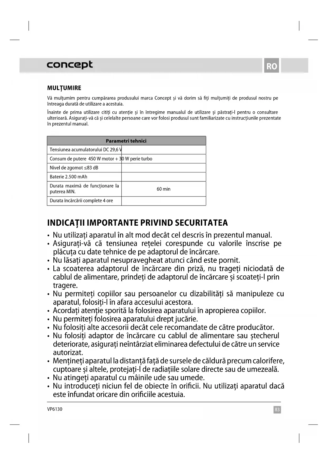 VP6130 MULȚUMIRE Vă mulțumim pentru cumpărarea produsului marca Concept și vă dorim să fiți mulțumiți de produsul nostru pe întreaga durată de utilizare a acestuia. Înainte de prima utilizare citiți cu atenție și în întregime manualul de utilizare și păstrați-l pentru o consultare ulterioară. Asigurați-vă că și celelalte persoane care vor folosi produsul sunt familiarizate cu instrucțiunile prezentate în prezentul manual. Parametri tehnici Tensiunea acumulatorului DC 29,6 V Consum de putere 450 W motor + 30 W perie turbo Nivel de zgomot ≤83 dB Baterie 2.500 mAh Durata maximă de funcționare la puterea MIN. 60 min Durata încărcării complete 4 ore